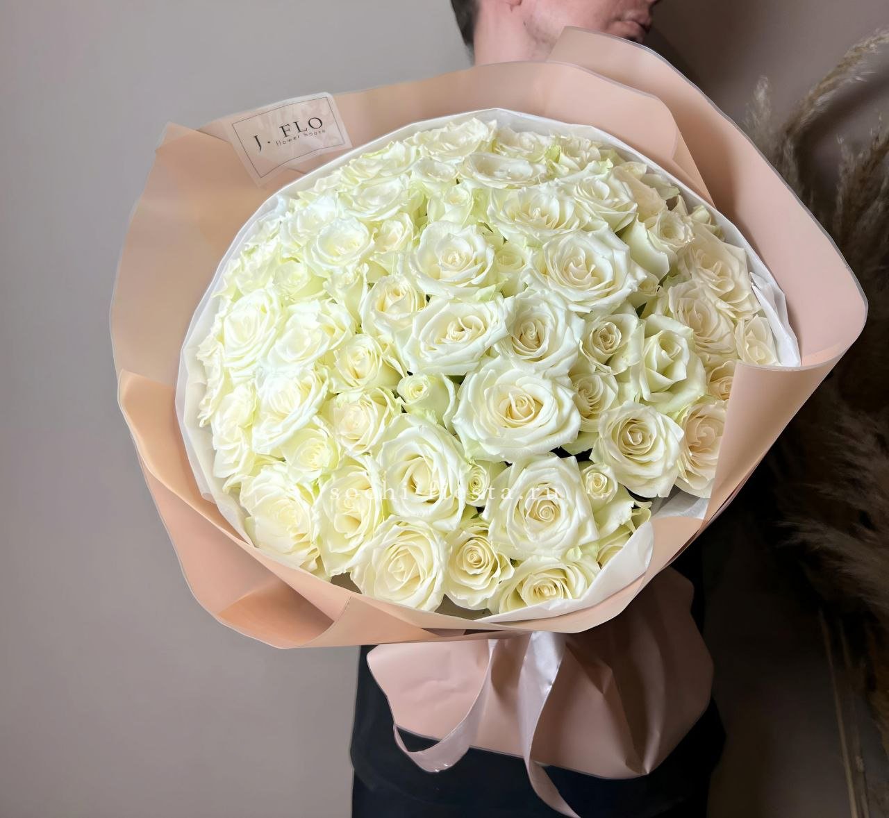 Сто одна белоснежная роза из Кении собрана в монохромную композицию с безупречной геометрией. Каждый бутон держит форму и создаёт плотное облако света. Для момента когда слова не нужны.