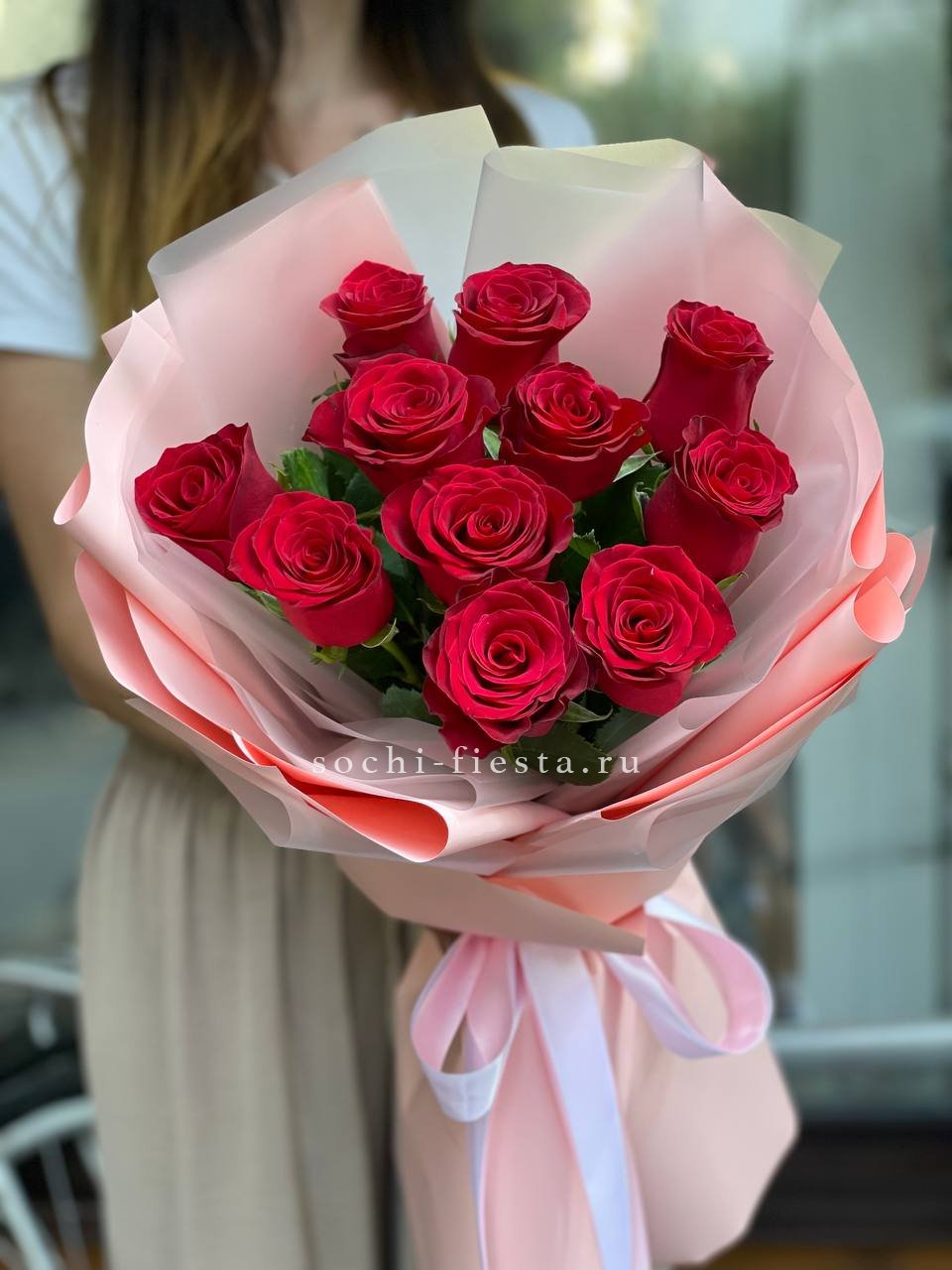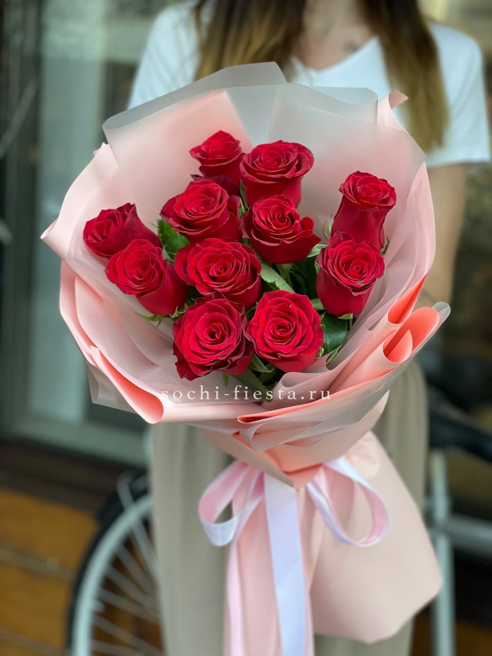 15 роз сорта джумилия, лента, дизайнерская упаковка.