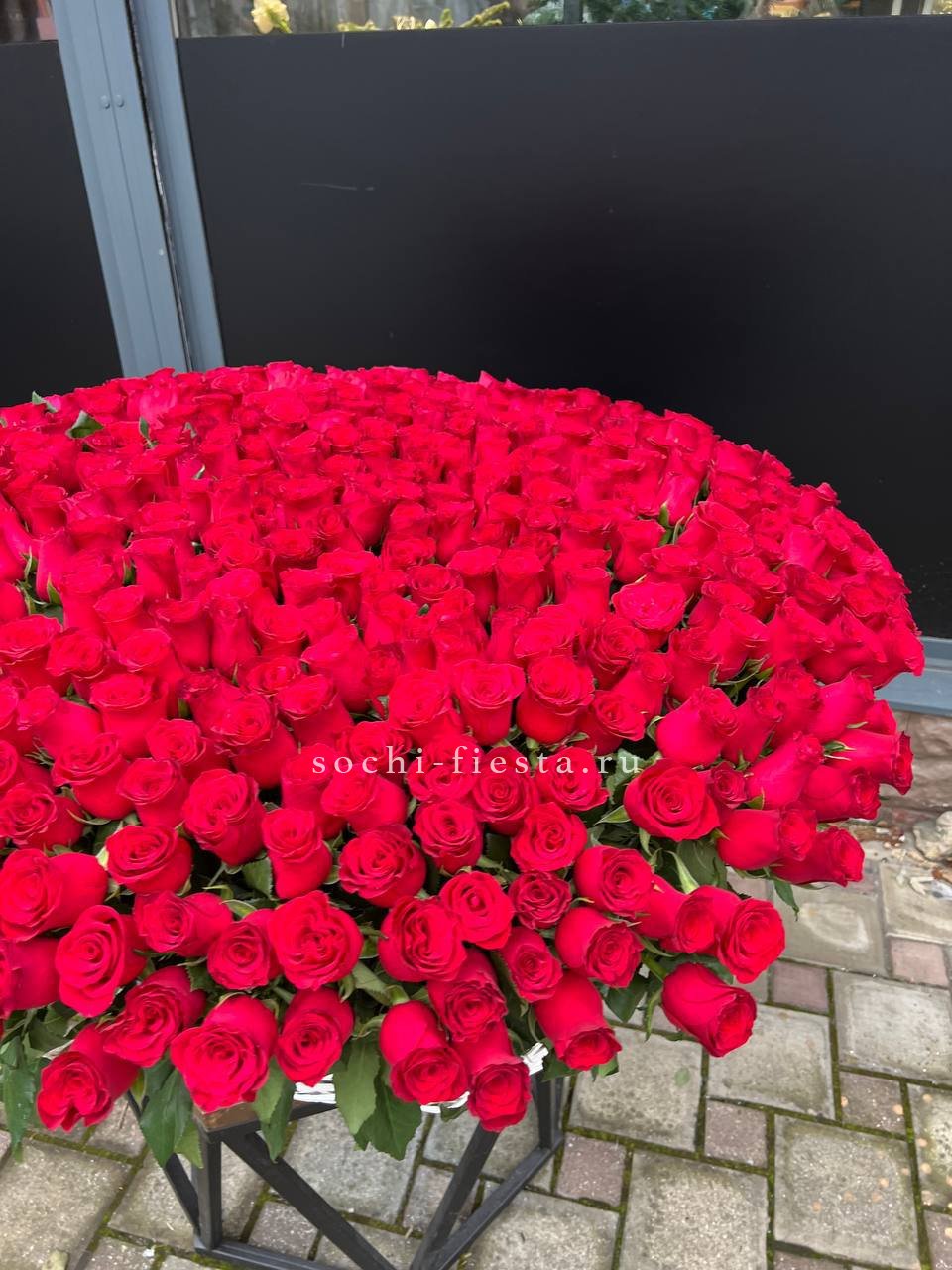 Французские розы глубокого красного оттенка образуют плотное цветочное полотно в корзине. Пятьсот один бутон создает монументальную композицию, где каждый цветок усиливает общее впечатление.
