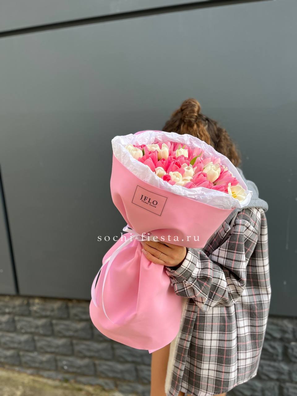 Пятьдесят один бутон в мягкой бело-розовой гамме создает объемную форму с живым ритмом. Микс оттенков добавляет воздушности и естественной динамики композиции.