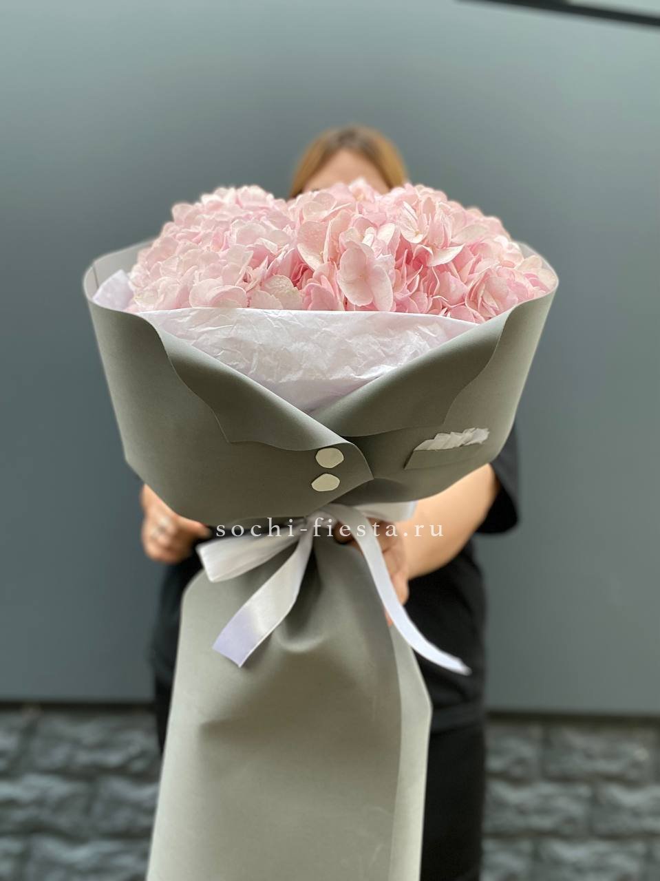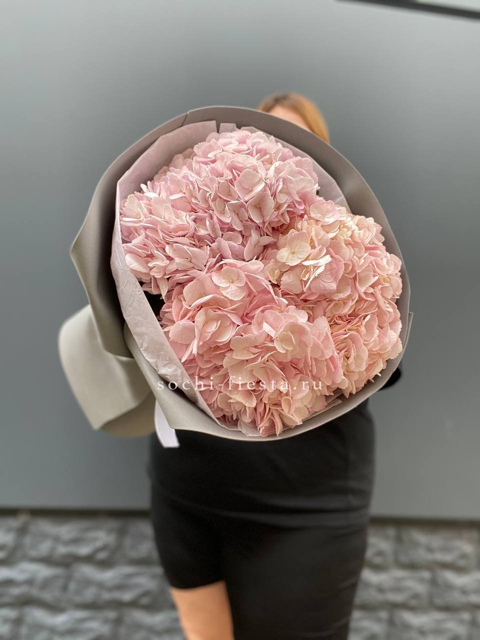 Семь пышных шапок гортензий собраны в природном джутовом кашпо. Плотные соцветия создают облачную текстуру, где каждый бутон дополняет общий объем. Композиция готова к размещению на столе или комоде без дополнительных усилий.