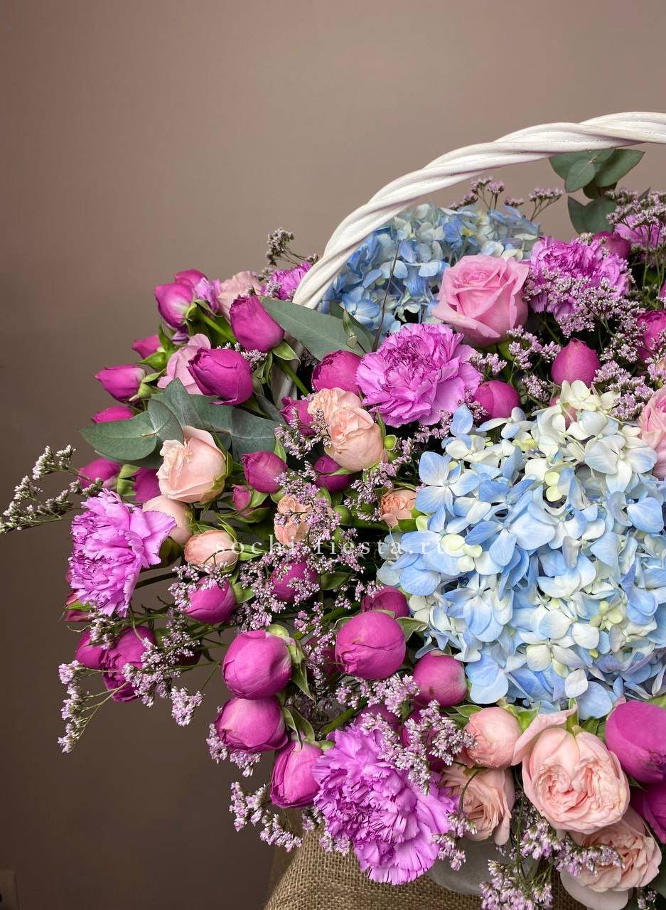 Корзина в лавандовых тонах объединяет пышные соцветия гортензии, кустовые и классические розы с воздушным лимониумом. Эвкалипт добавляет графику и свежесть всей композиции.