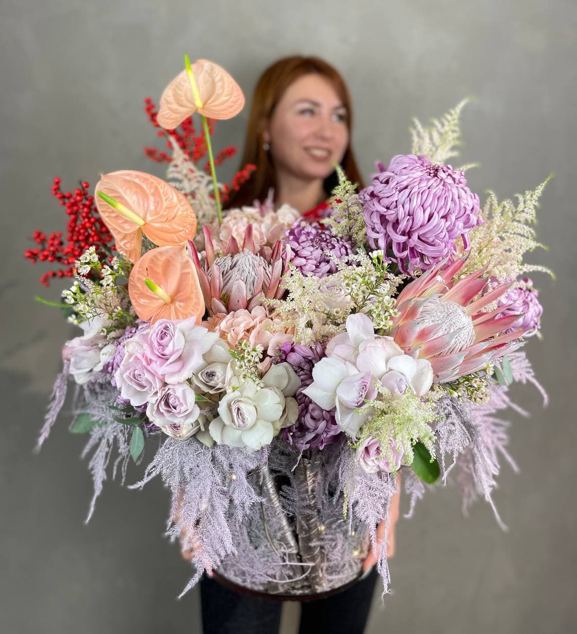 Крупные соцветия гортензии и экзотичные протеи создают плотную текстуру с глубокими переходами оттенков. Антуриумы и пионовидные розы добавляют объёма, а веточки илекса и хамелациума разбивают композицию лёгкими штрихами зелени.