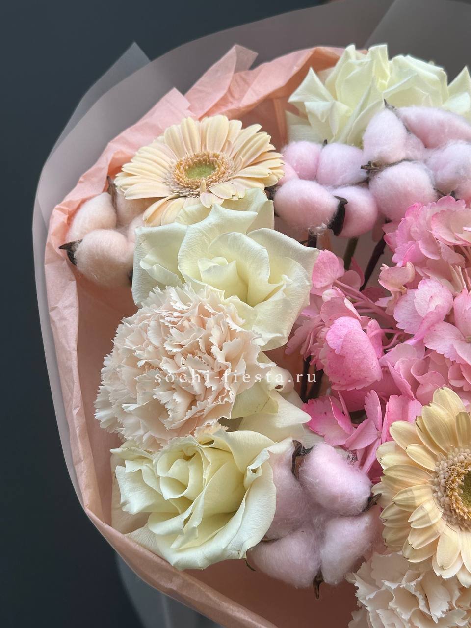Пышная гортензия задаёт объём, а розы и диантусы наполняют композицию мягкими переходами оттенков. Эвкалипт добавляет воздушности, не перегружая форму. Букет собран так, чтобы каждый цветок читался отдельно, но работал на общую картину.