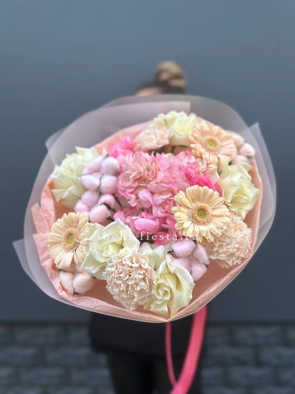 диантусы, розовые розы, гортензия, эвкалипт, вспомогательные цветы, лента, корейская пленка.