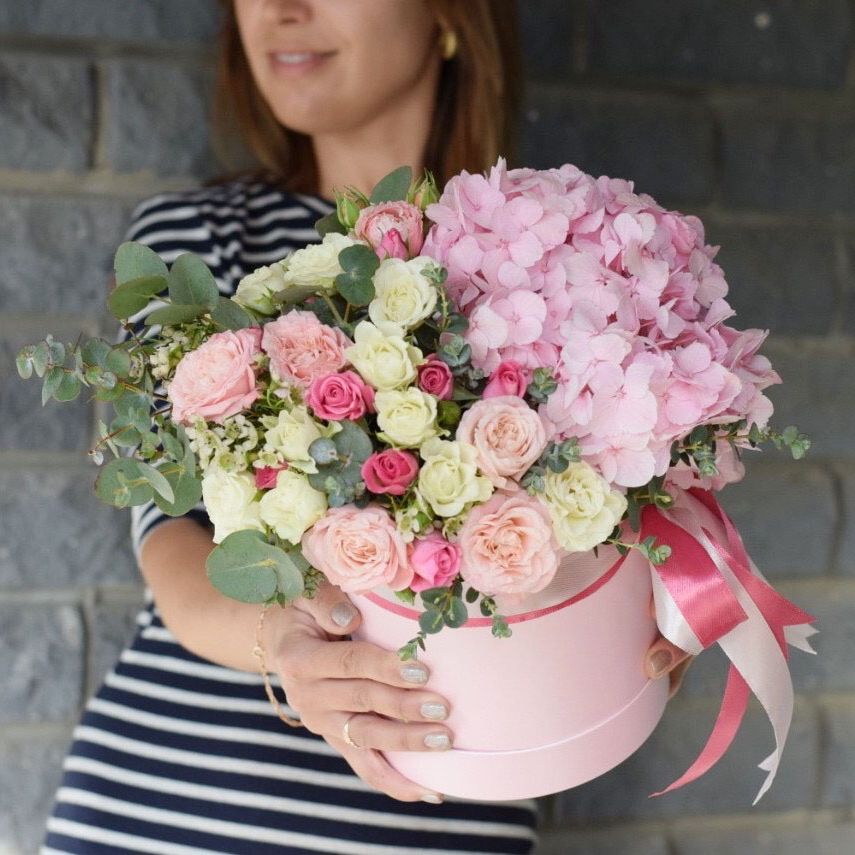 Семь соцветий гортензии раскрываются воздушным облаком с мягкими переходами оттенков. Букет дарит ощущение лёгкости и свежести летнего сада в любое время года.