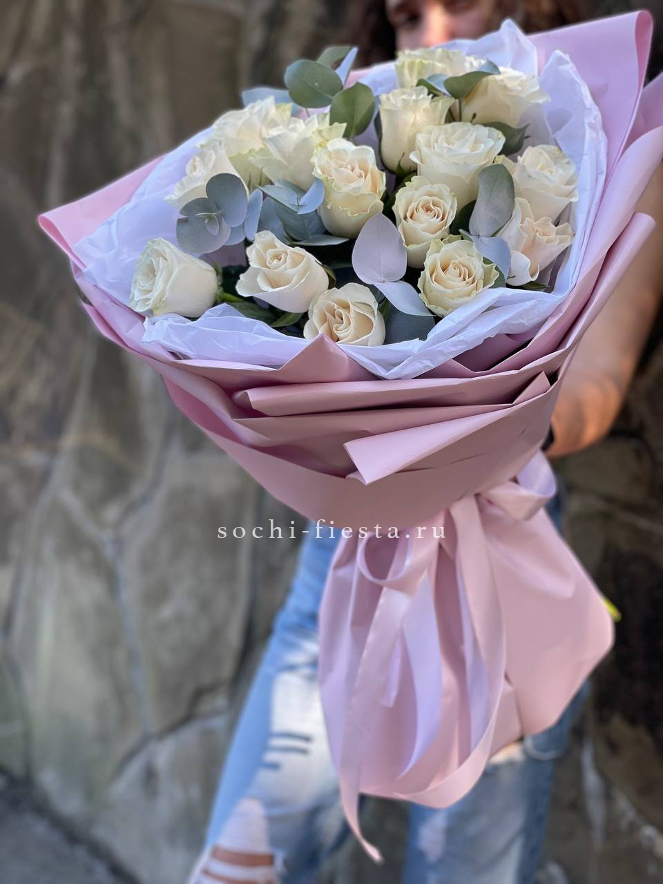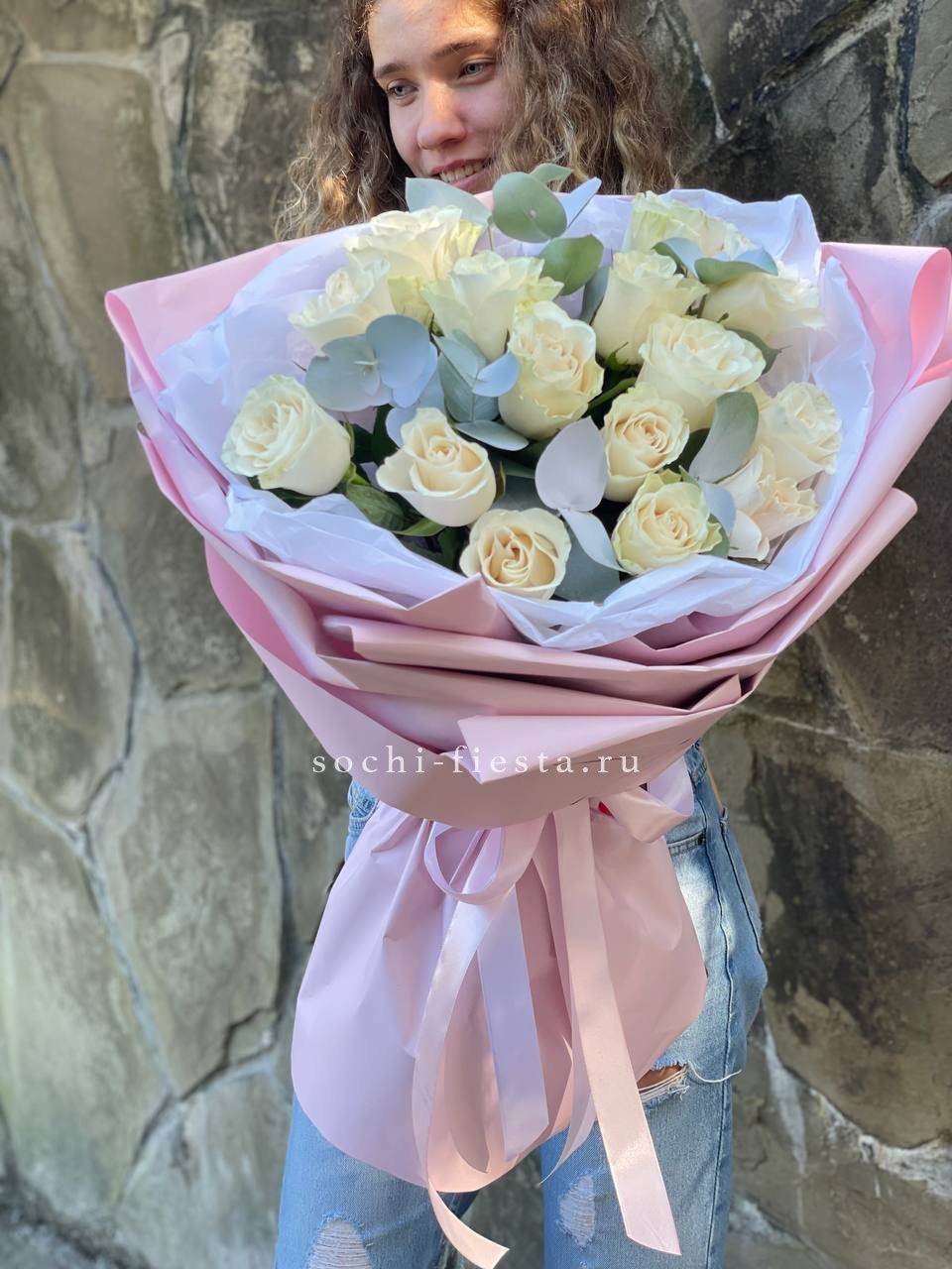 Этот букет — словно облако нежности и мечтательности. Бутончики кустовых роз, напоминающие тугие шарики, имеют светлый кремовый цвет с легким розовым оттенком. В сочетании с веточками свежего эвкалипта они создают атмосферу легкости и романтики. Это идеальный подарок для выражения самых светлых и теплых чувств, который растопит любое сердце.