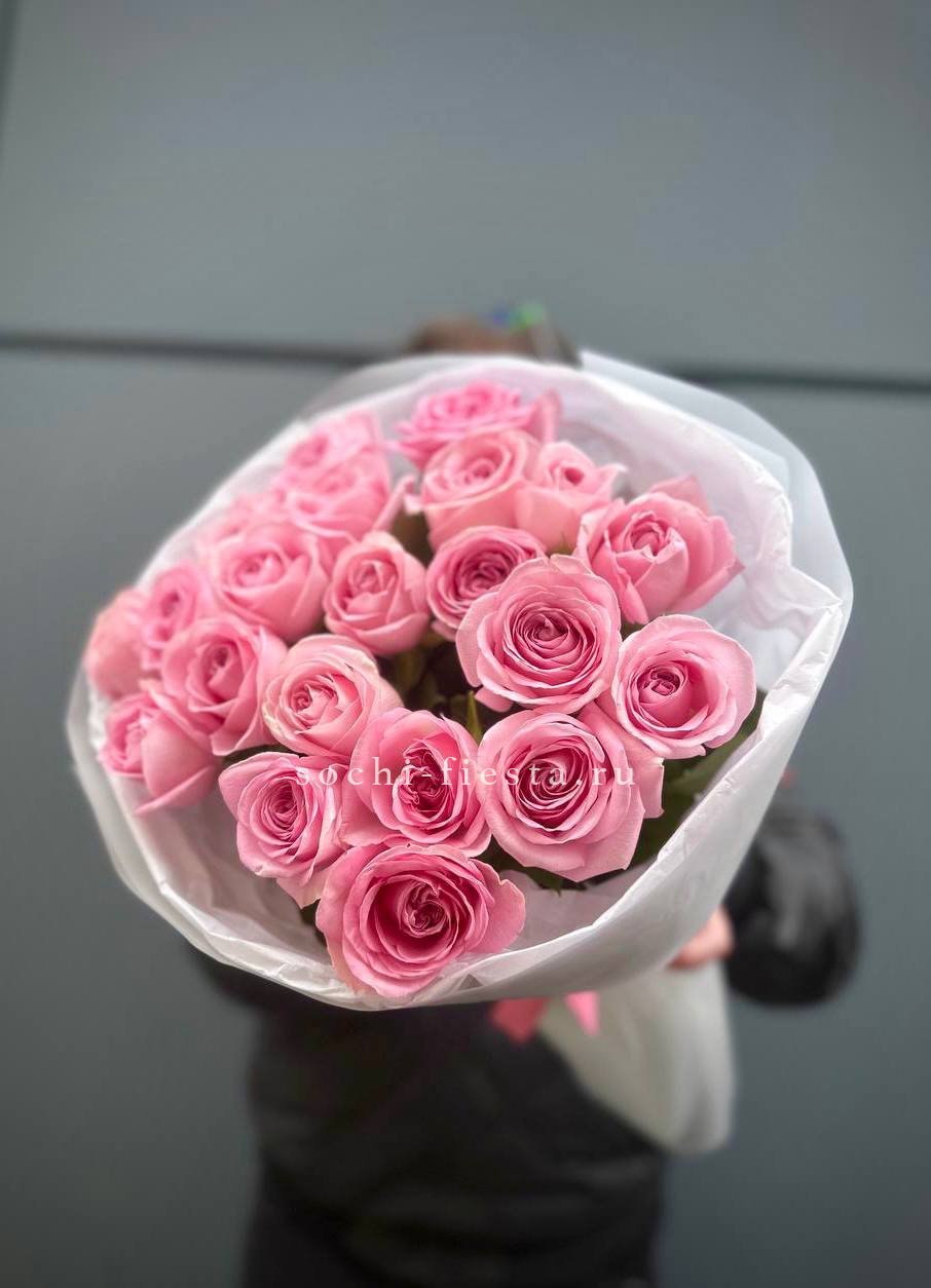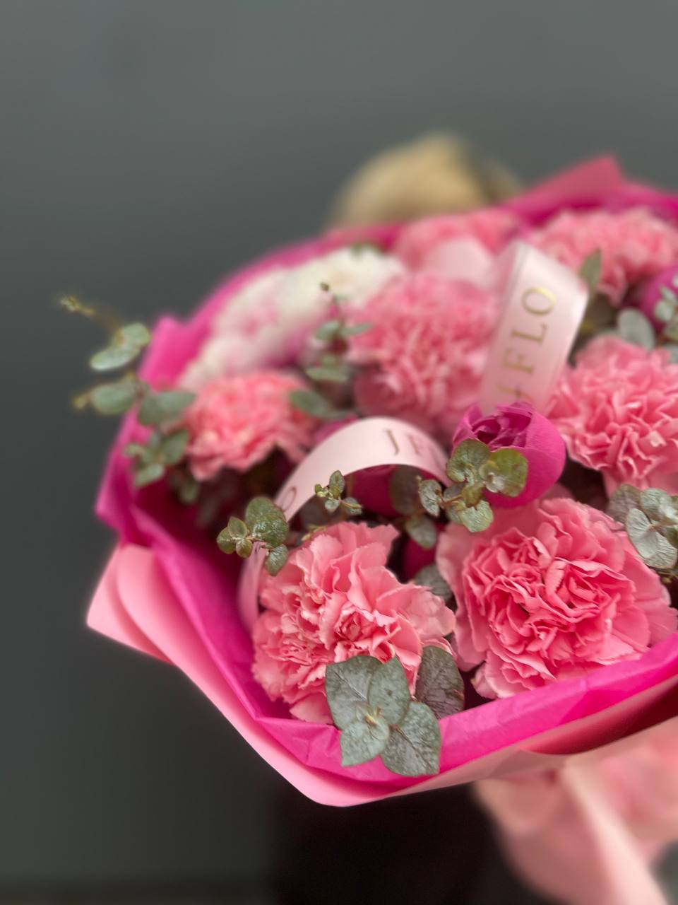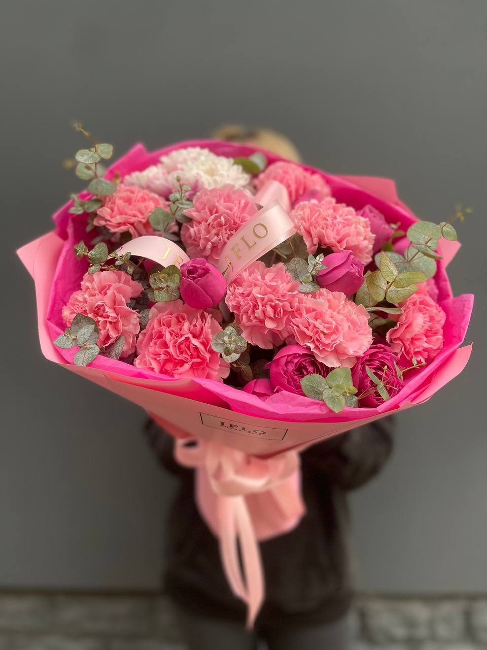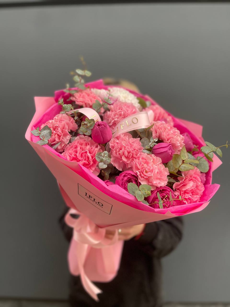 Этот букет — настоящий манифест женственности и ярких эмоций! Он выглядит очень эффектно за счет сочетания разных оттенков розового и игры фактур.