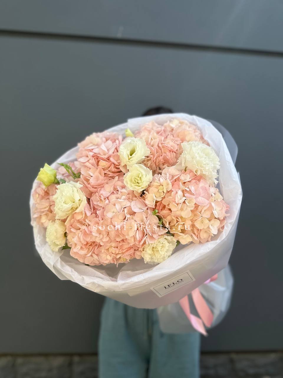 Розовая гортензия и эустома раскрывают свою красоту в каждом лепестке. Мягкие оттенки переходят один в другой, создавая спокойное и гармоничное впечатление.