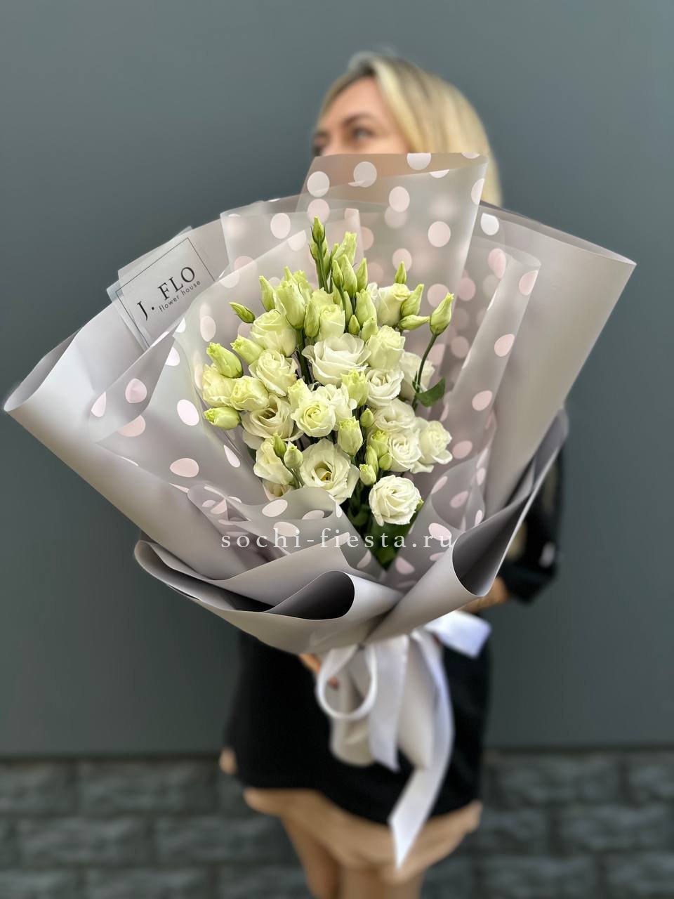 Пятнадцать воздушных эустом собраны в пудровое облако с мягкими переходами оттенков. Многослойные бутоны создают объёмную текстуру и удивительную глубину композиции.