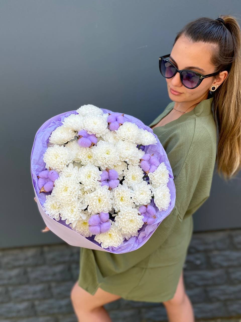 Fifteen веток кустовой хризантемы образуют пышное облако из множества мелких бутонов. Простая упаковка не отвлекает от густоты соцветий и их природной фактуры. Букет долго сохраняет свежесть и объём.