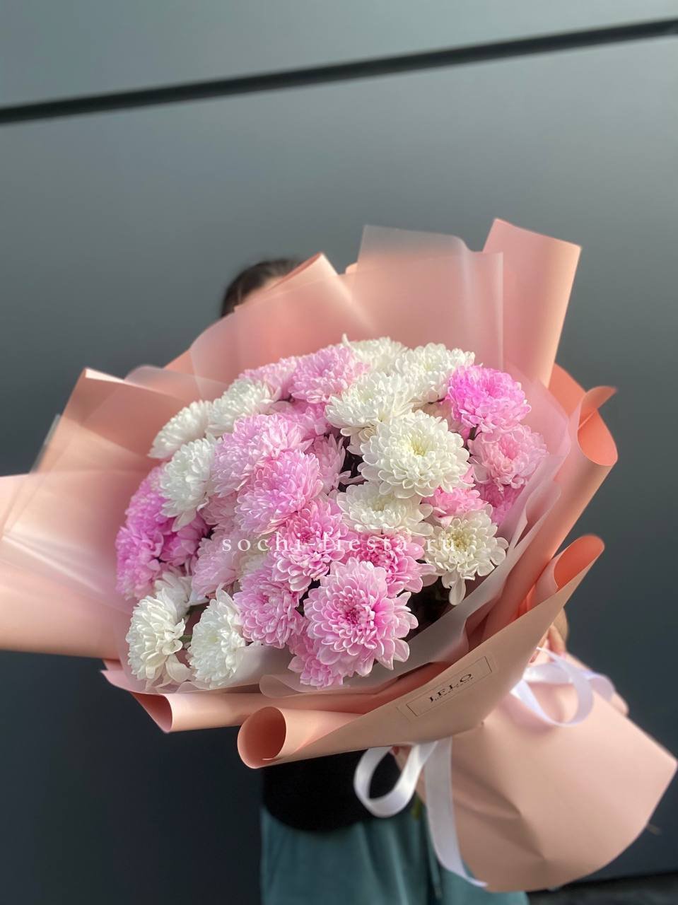 Бело-розовые кустовые хризантемы создают мягкий переход оттенков. Лепестки формируют воздушную структуру, где светлые тона перетекают в насыщенные. Композиция дышит и притягивает взгляд своей лёгкостью.