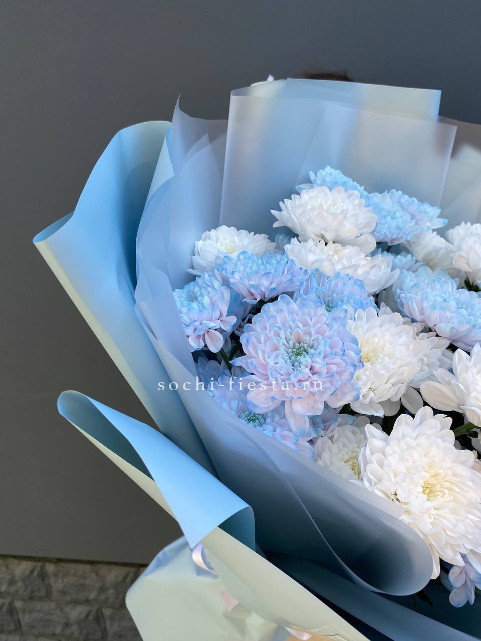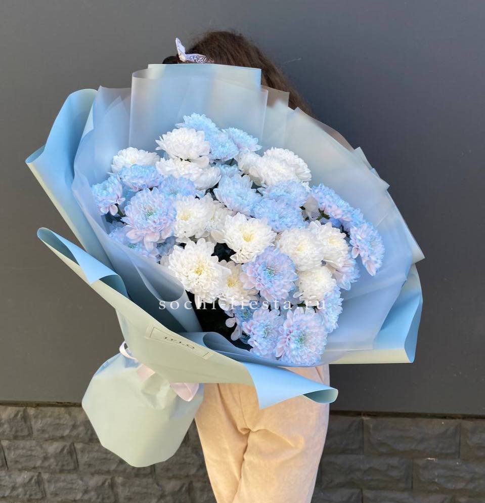 Пять веток кустовой хризантемы с множеством соцветий создают пышную воздушную массу. Букет напоминает утренний сад, где каждая ветка живёт своим ритмом и дарит ощущение лёгкости.