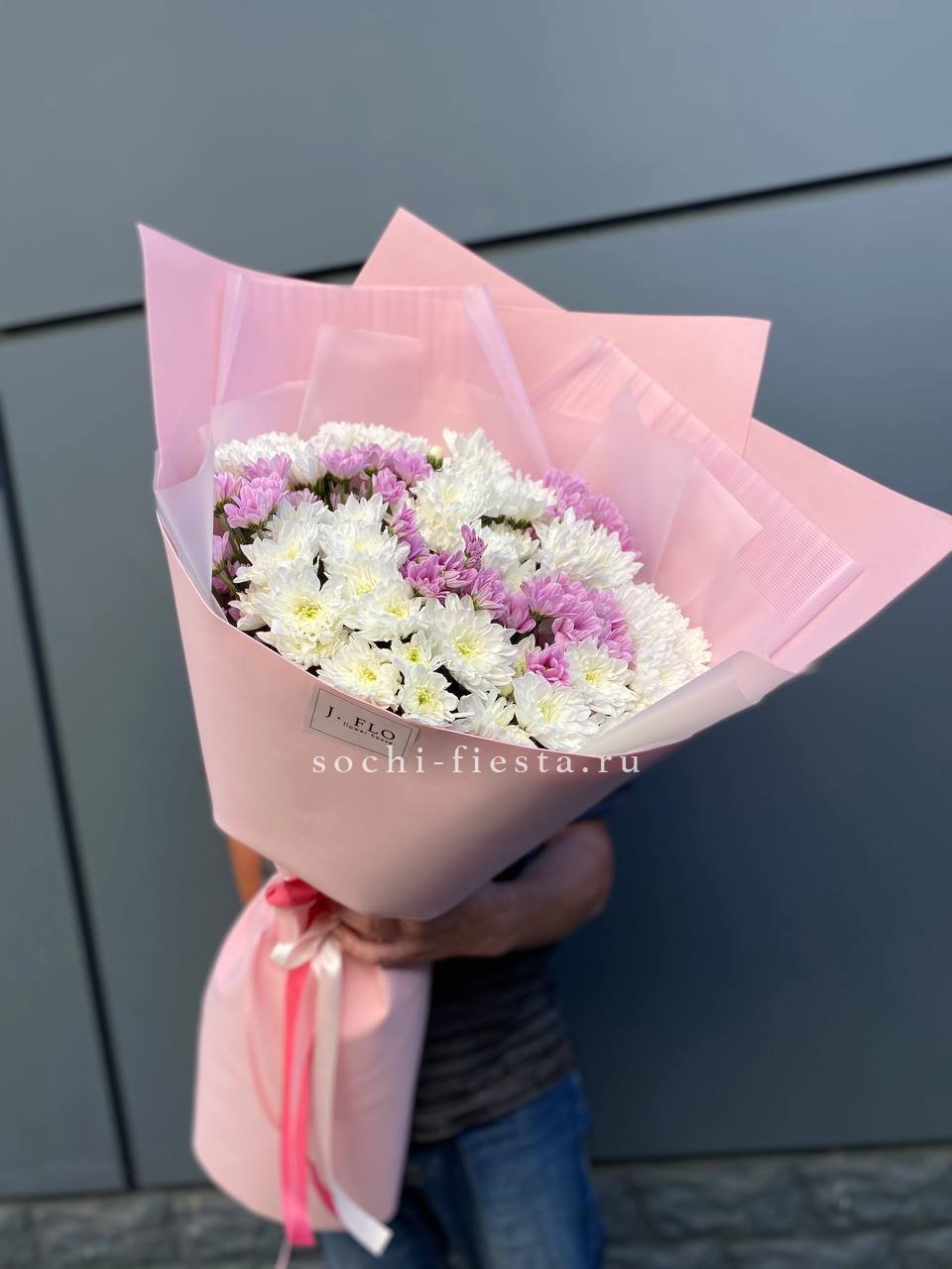 Пятнадцать веток кустовых хризантем с множеством бутонов создают пышную композицию с воздушной фактурой. Оформление из фоамирана добавляет букету завершенность и мягкий силуэт.