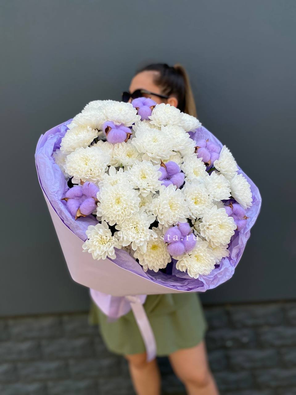 Пушистые коробочки хлопка добавляют воздушности между соцветиями хризантем. Природная фактура встречается с декоративной упаковкой в компактной форме. Букет держит объём и выглядит свежо несколько дней.