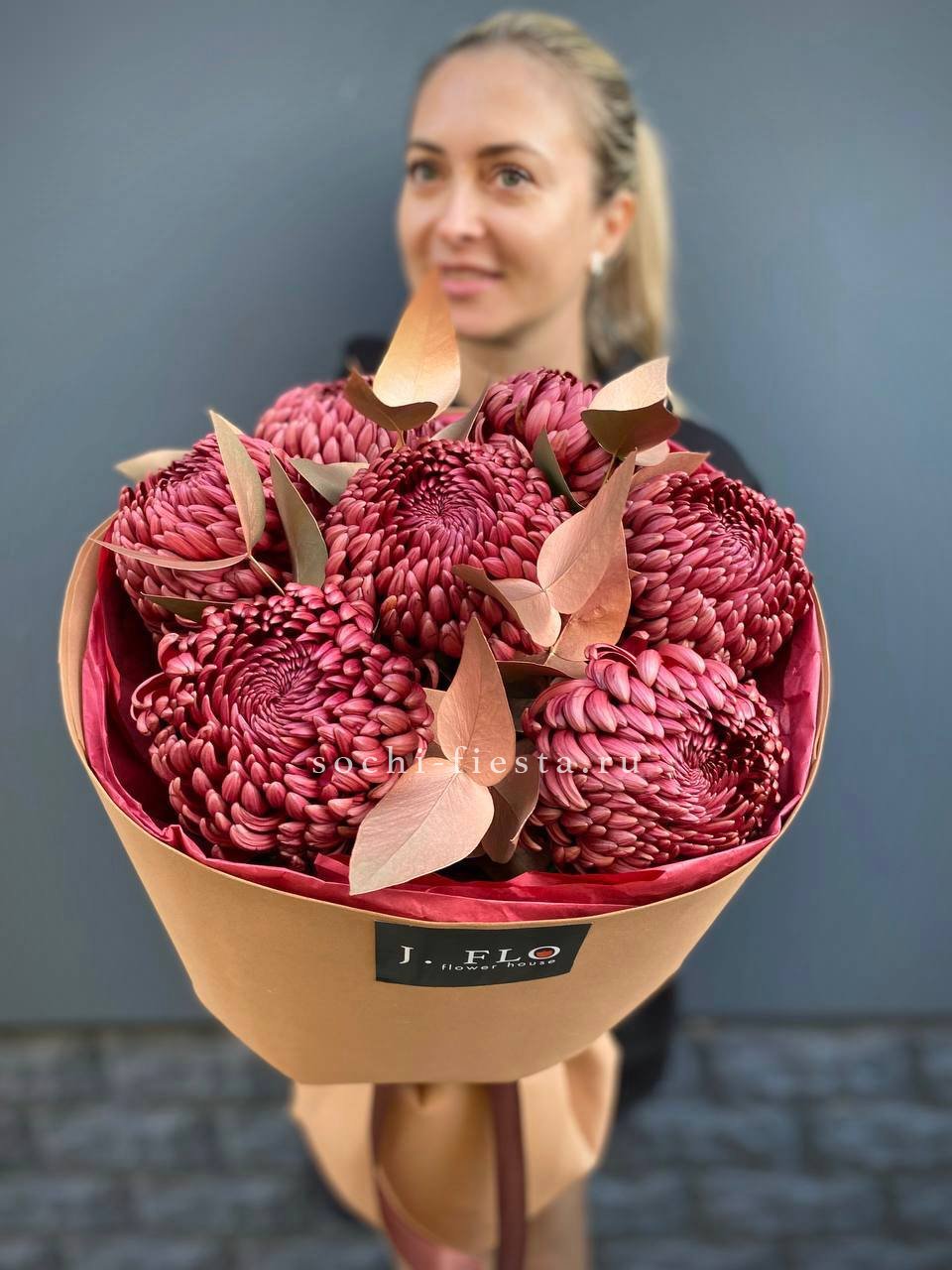Теплый шоколадно-золотой оттенок хризантем создает уютное осеннее настроение. Семь пышных соцветий собраны в компактную композицию с веточками эвкалипта.
