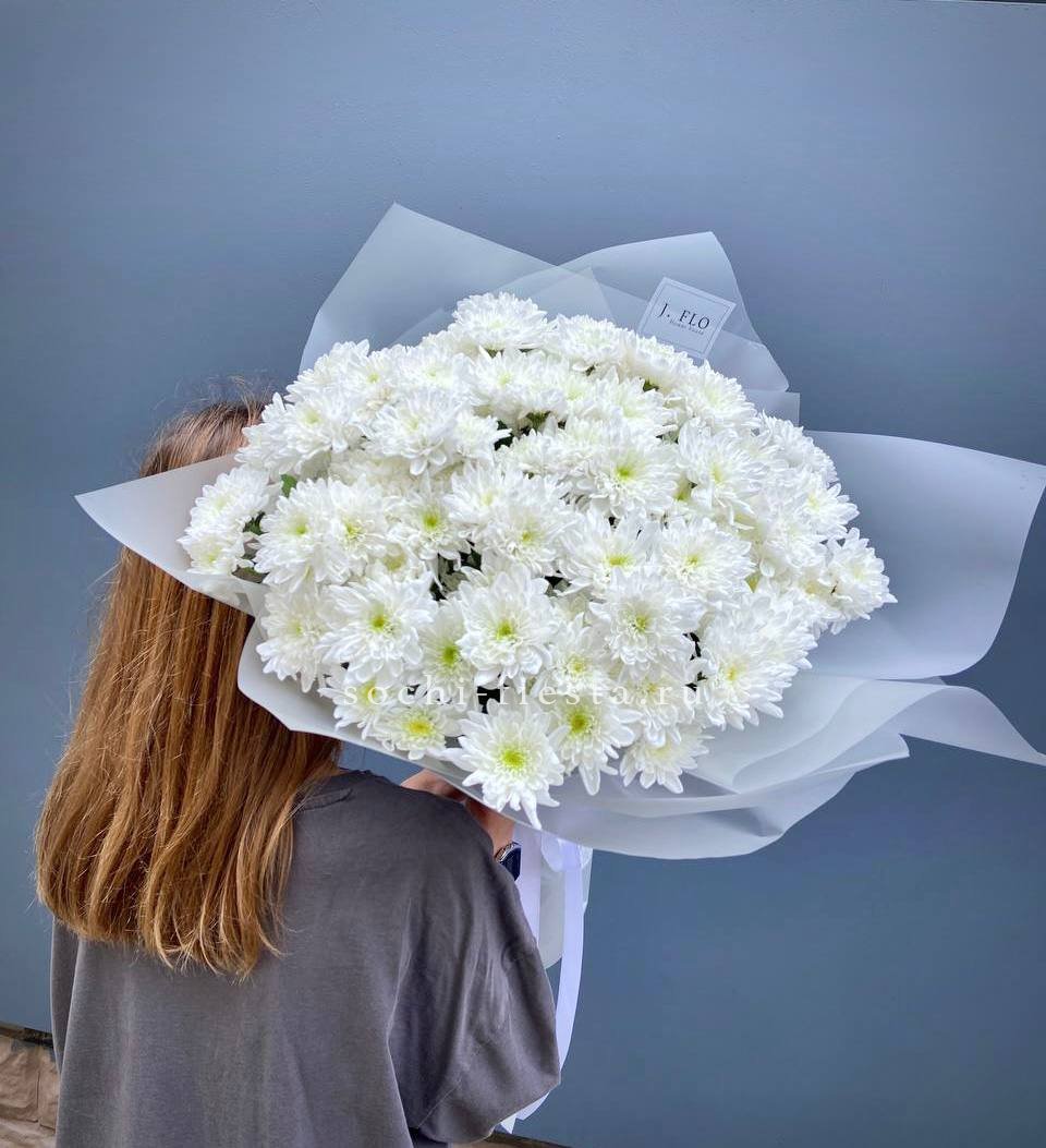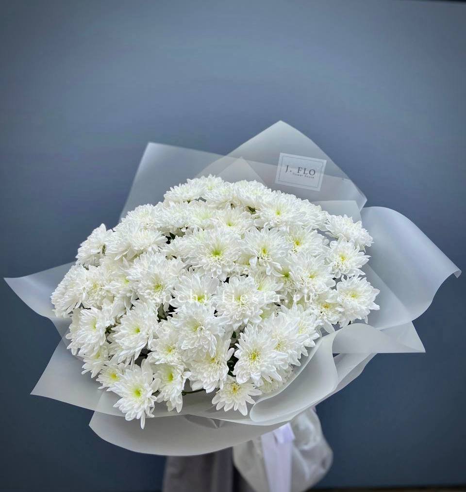 Пятнадцать веток кустовой хризантемы в натуральном крафте. Множество мелких соцветий формируют пышную шапку с естественной россыпью бутонов, подчёркнутую простотой оформления.