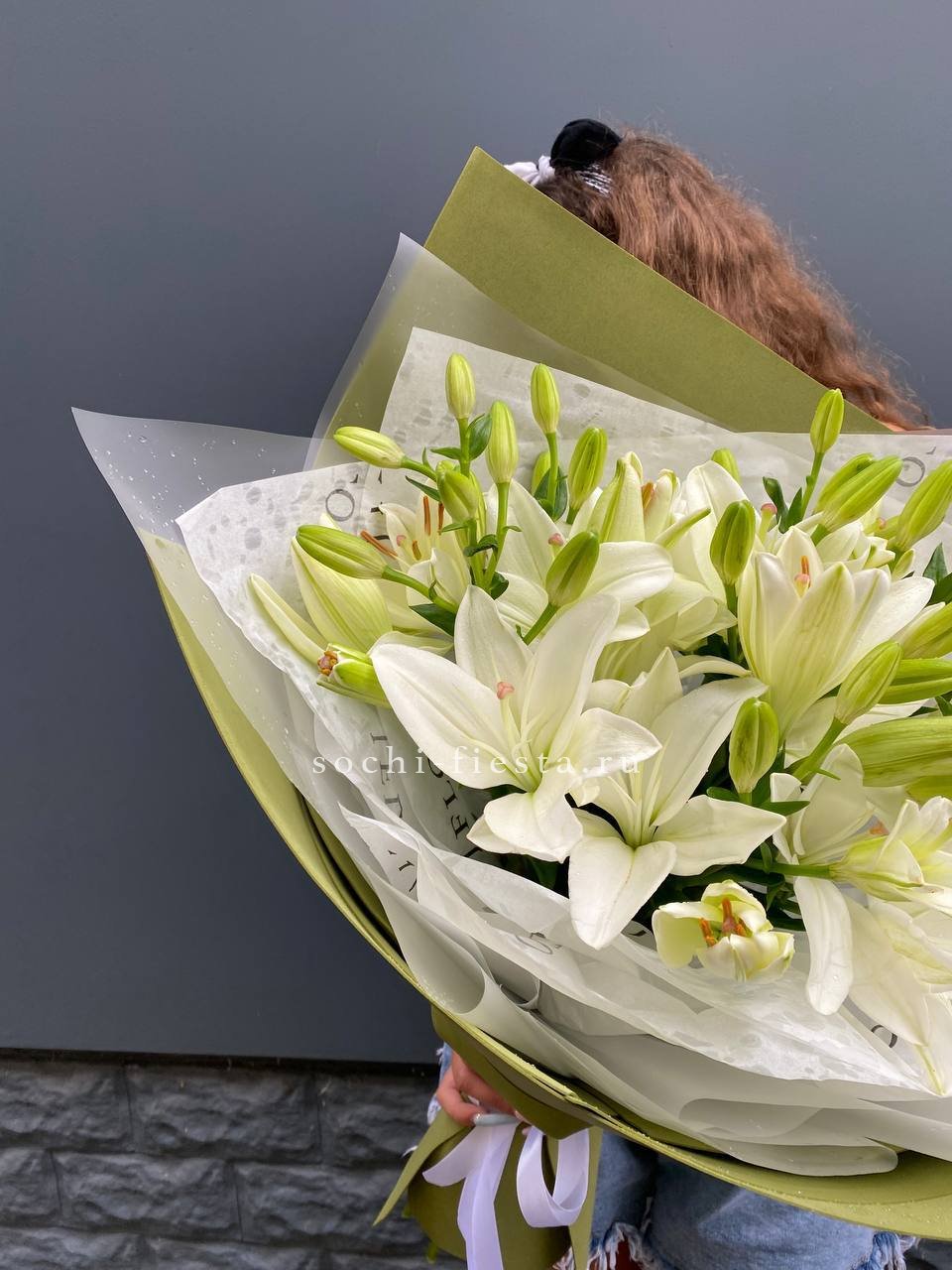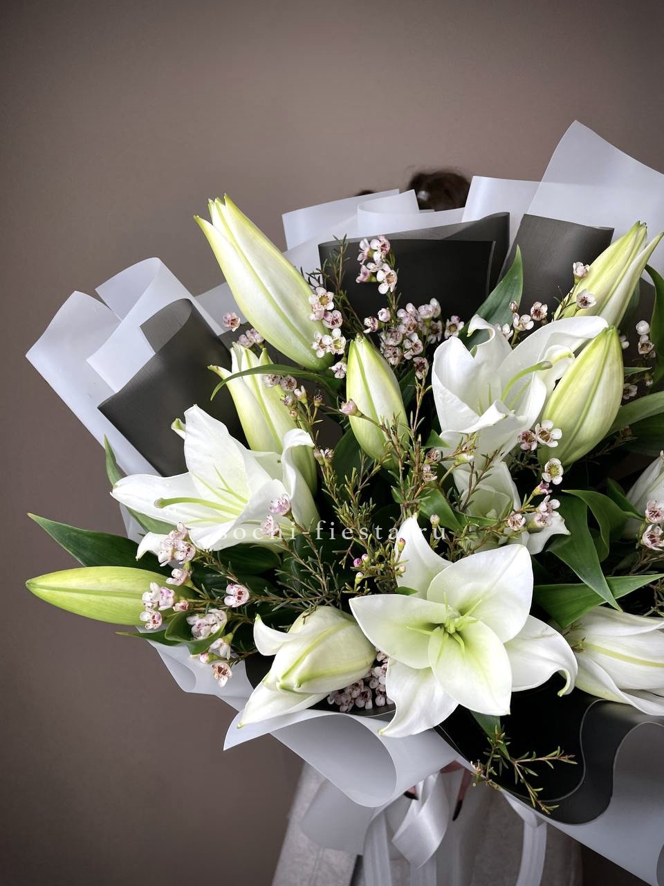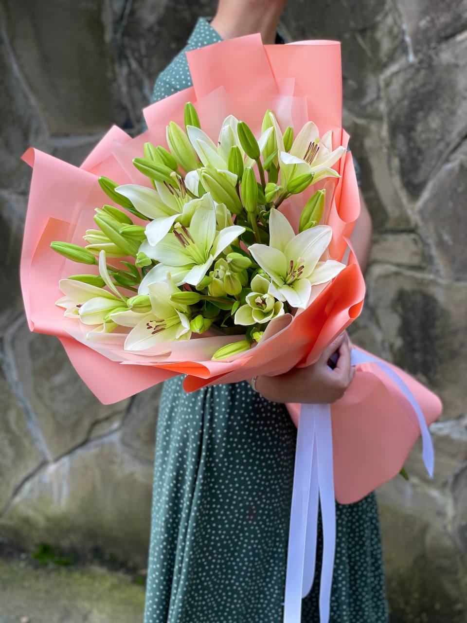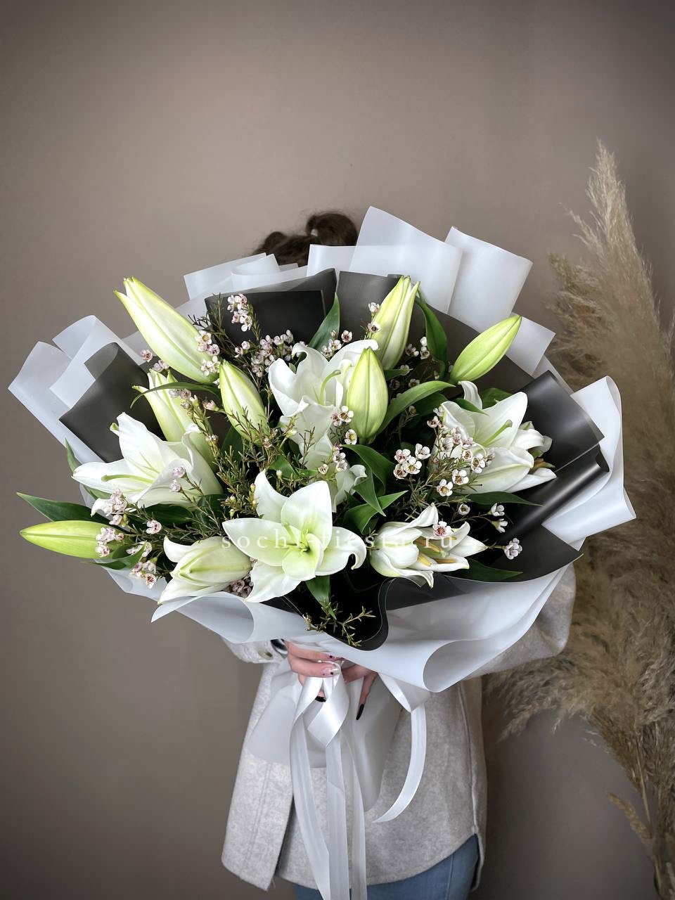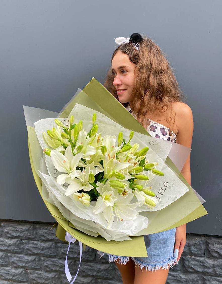 Девять махровых бутонов с плотно уложенными лепестками создают объёмную композицию. Пионовидные лилии раскрываются постепенно, удерживая форму несколько дней. Букет выглядит самодостаточно и занимает заметное место в интерьере.