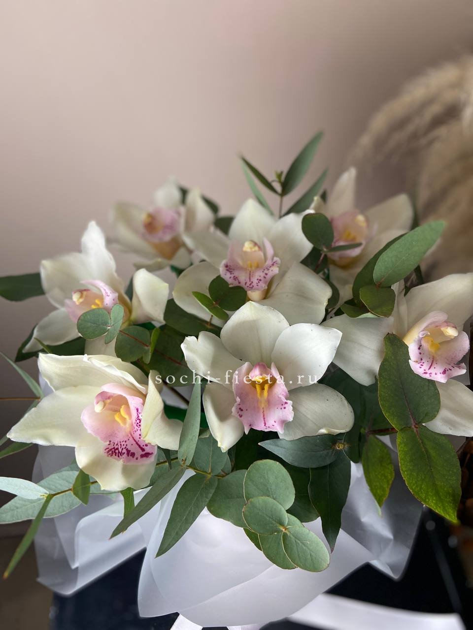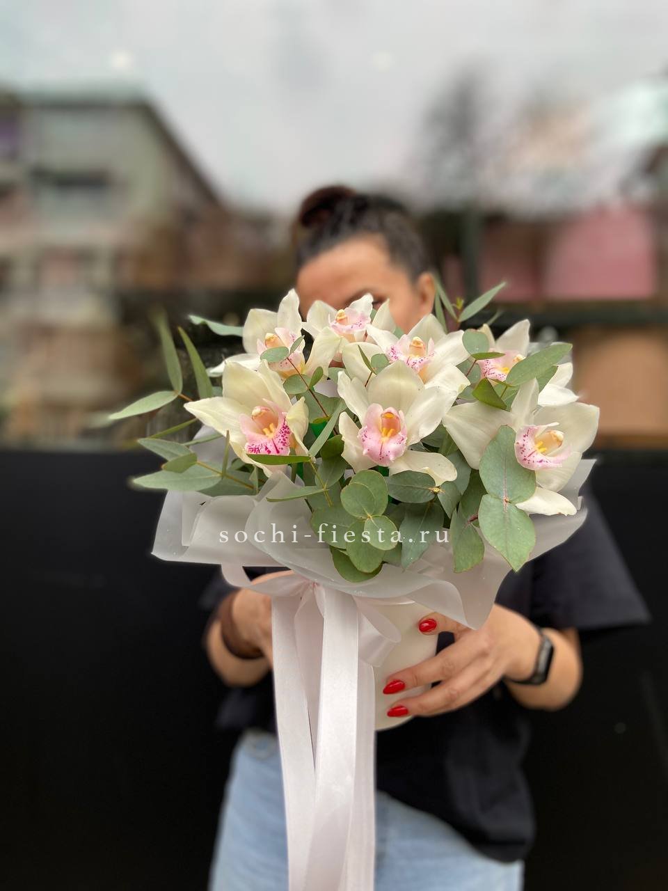 Цимбидиум в круглом боксе дополнен лимониумом и эвкалиптом. Композиция компактна, держит форму и долго сохраняет свежий вид.