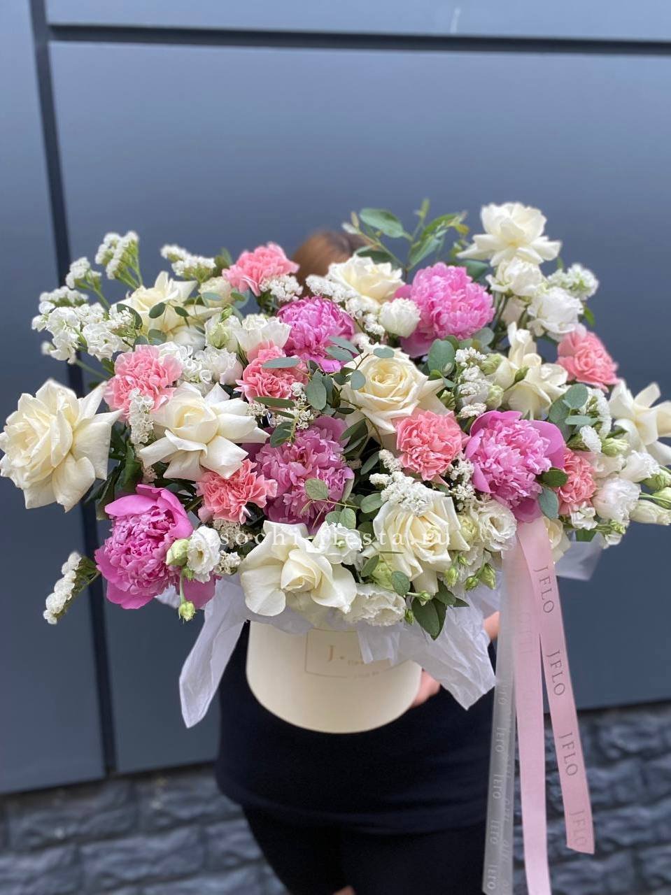 Пионы Buttons с их округлыми махровыми головками собраны в плотную композицию. Дизайнерская упаковка подчёркивает архитектуру букета, а комбинированная текстура материалов добавляет объём и завершённость.