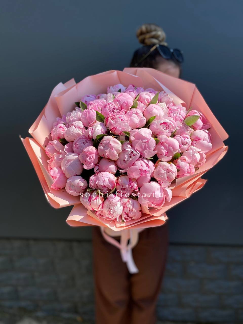 Пятьдесят один пион собраны в объёмную композицию, которая заполняет пространство цветом и ароматом.