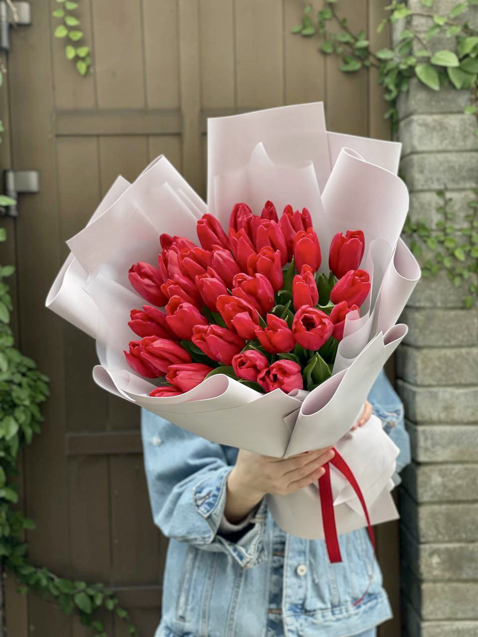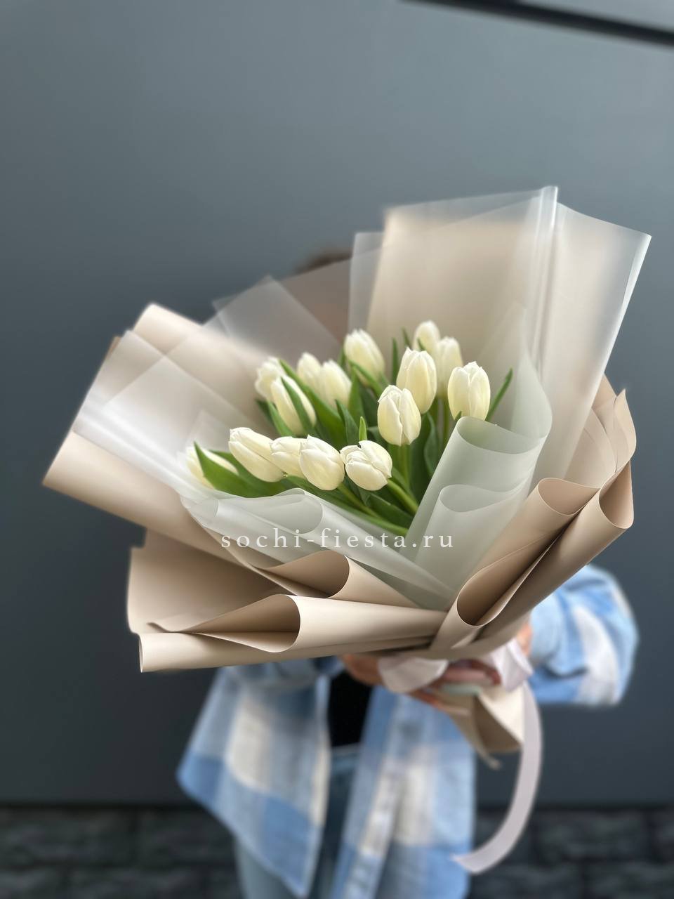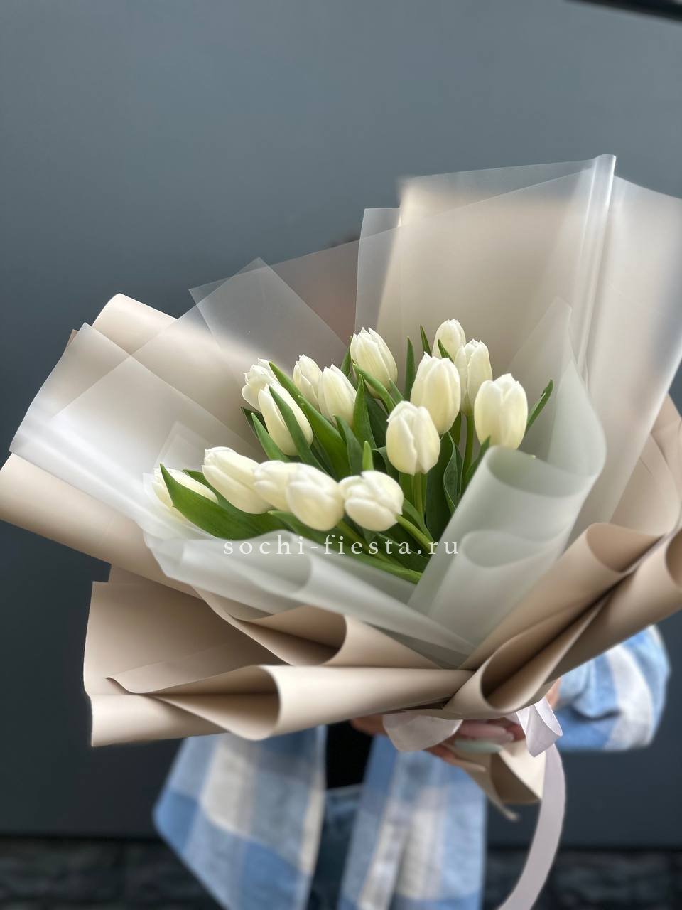 Пятьдесят один белоснежный тюльпан собран в плотный монохромный букет с мягкими соцветиями лагуруса. Чистая графика весенних бутонов создает ощущение свежести и простора.