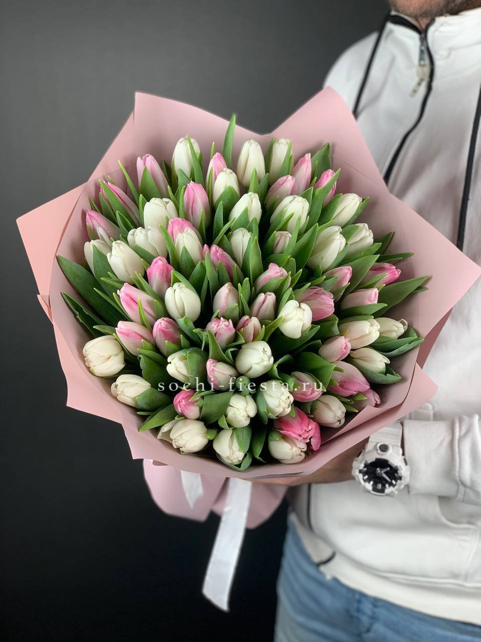 тюльпан 61 шт., лента, дизайнерская бумага.