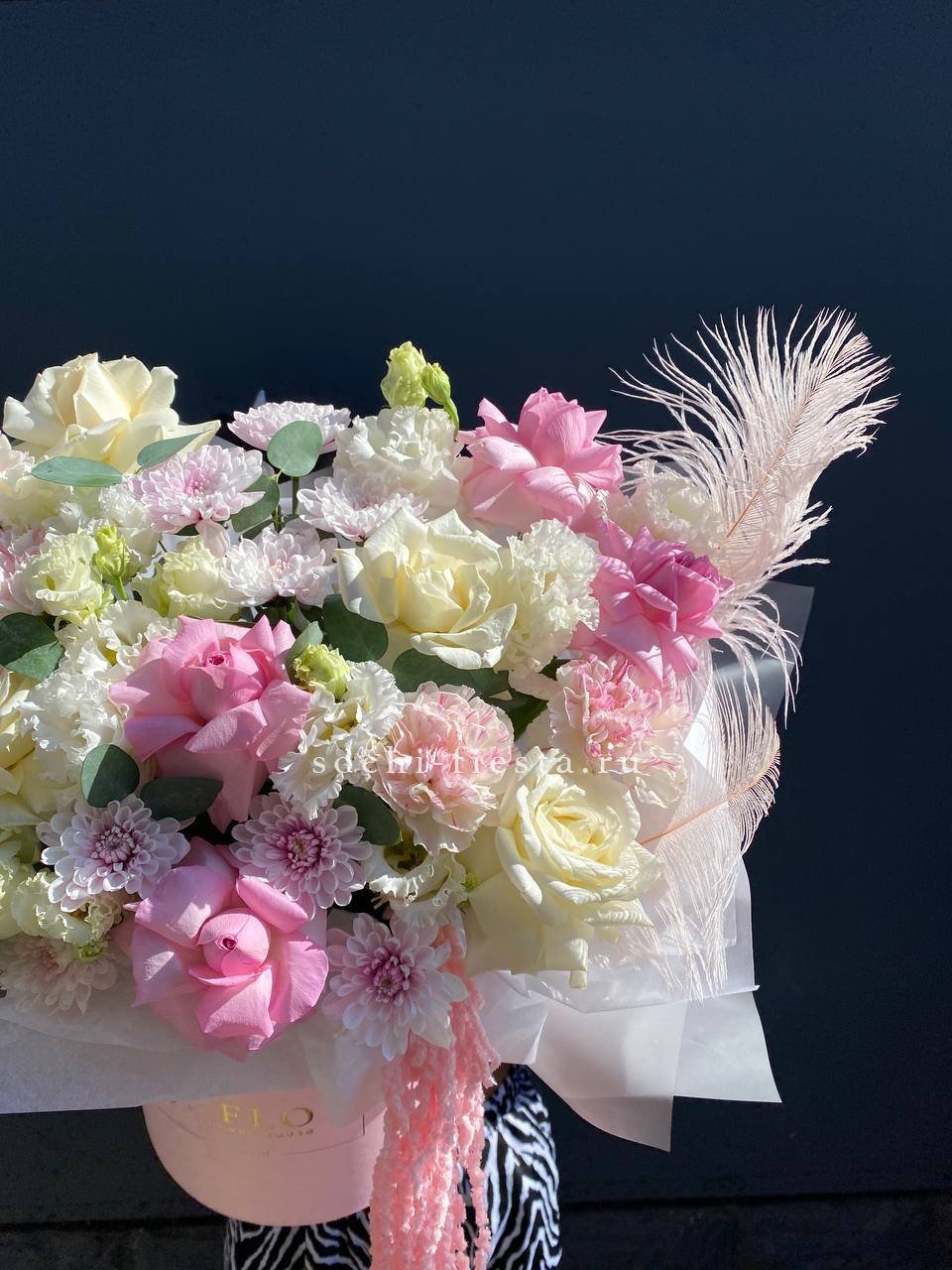 Перья и амарантус добавляют композиции воздушности и движения между французскими розами и хризантемами. Эустома и диантусы смягчают силуэт и создают многослойную фактуру в высоком боксе.