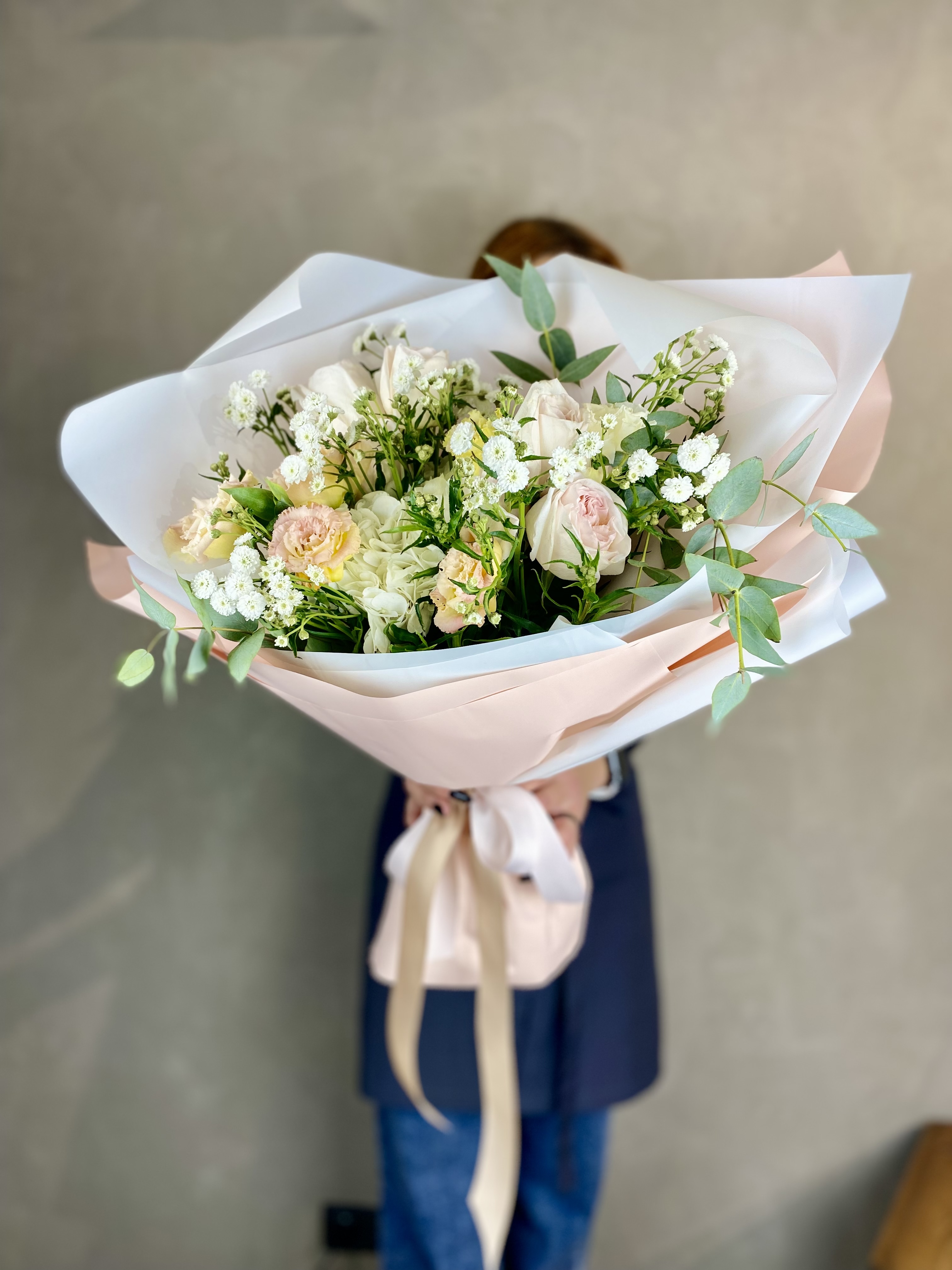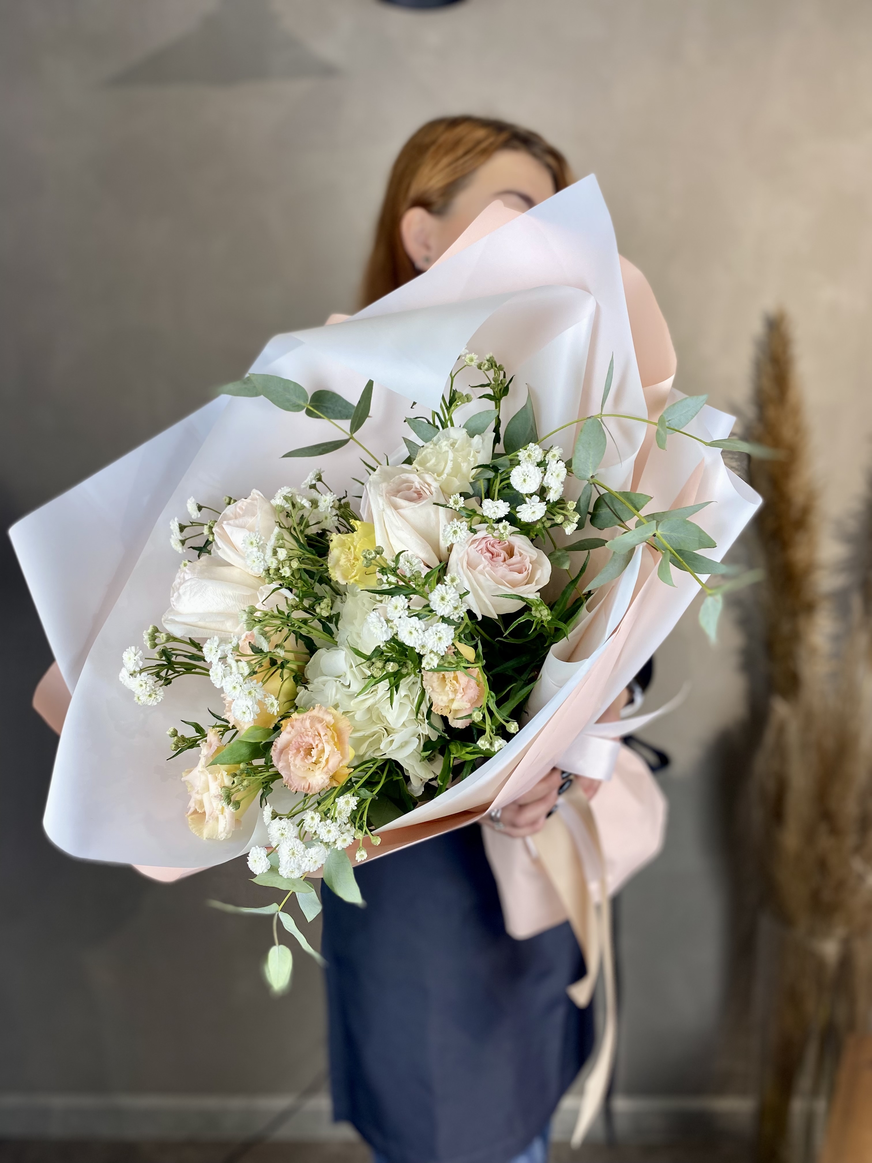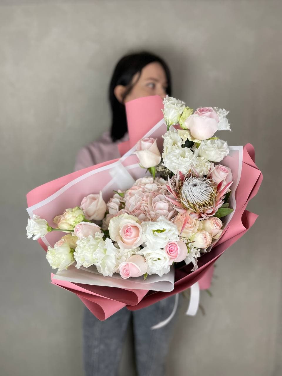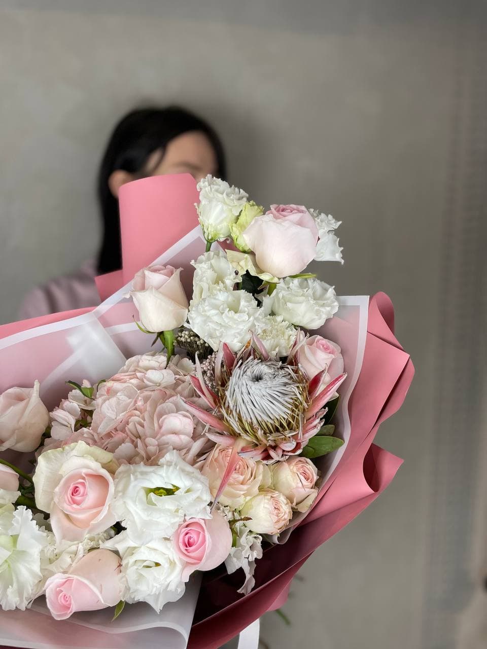 Протея задает графичный акцент, а пушистые шапки гортензии создают объем и глубину. Пионовидные розы и эустома дополняют композицию мягкими переходами, озотамнус добавляет воздушность.
