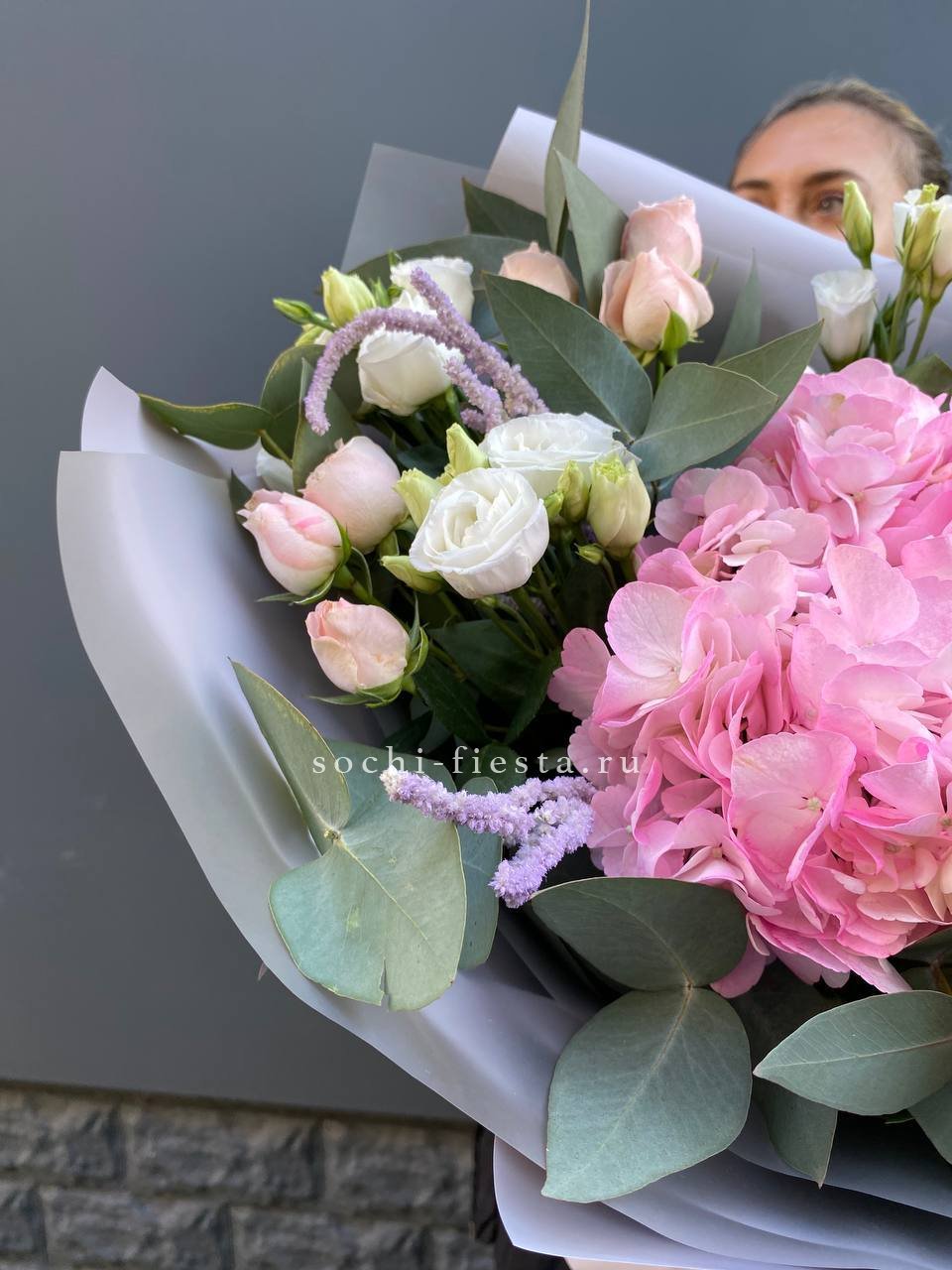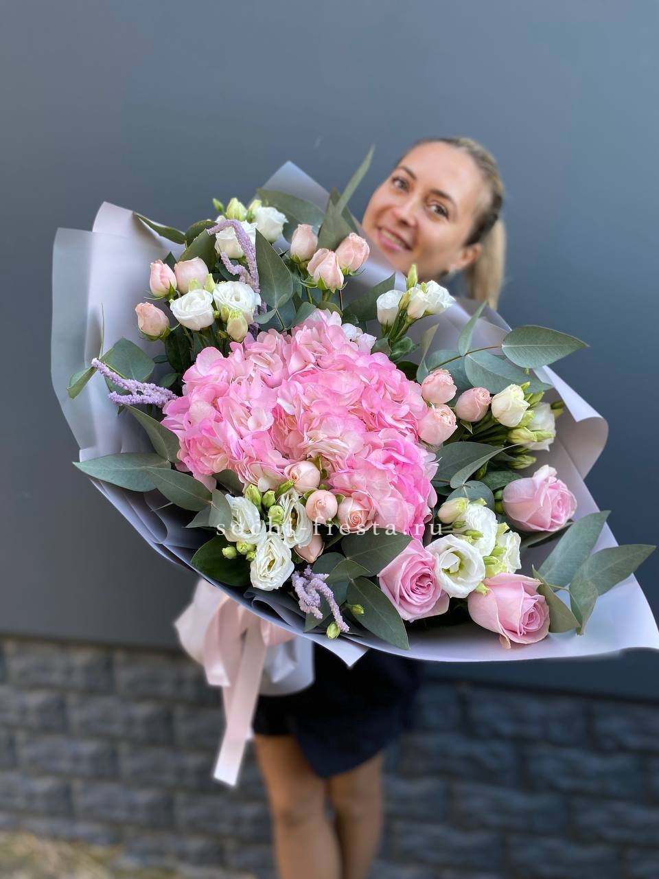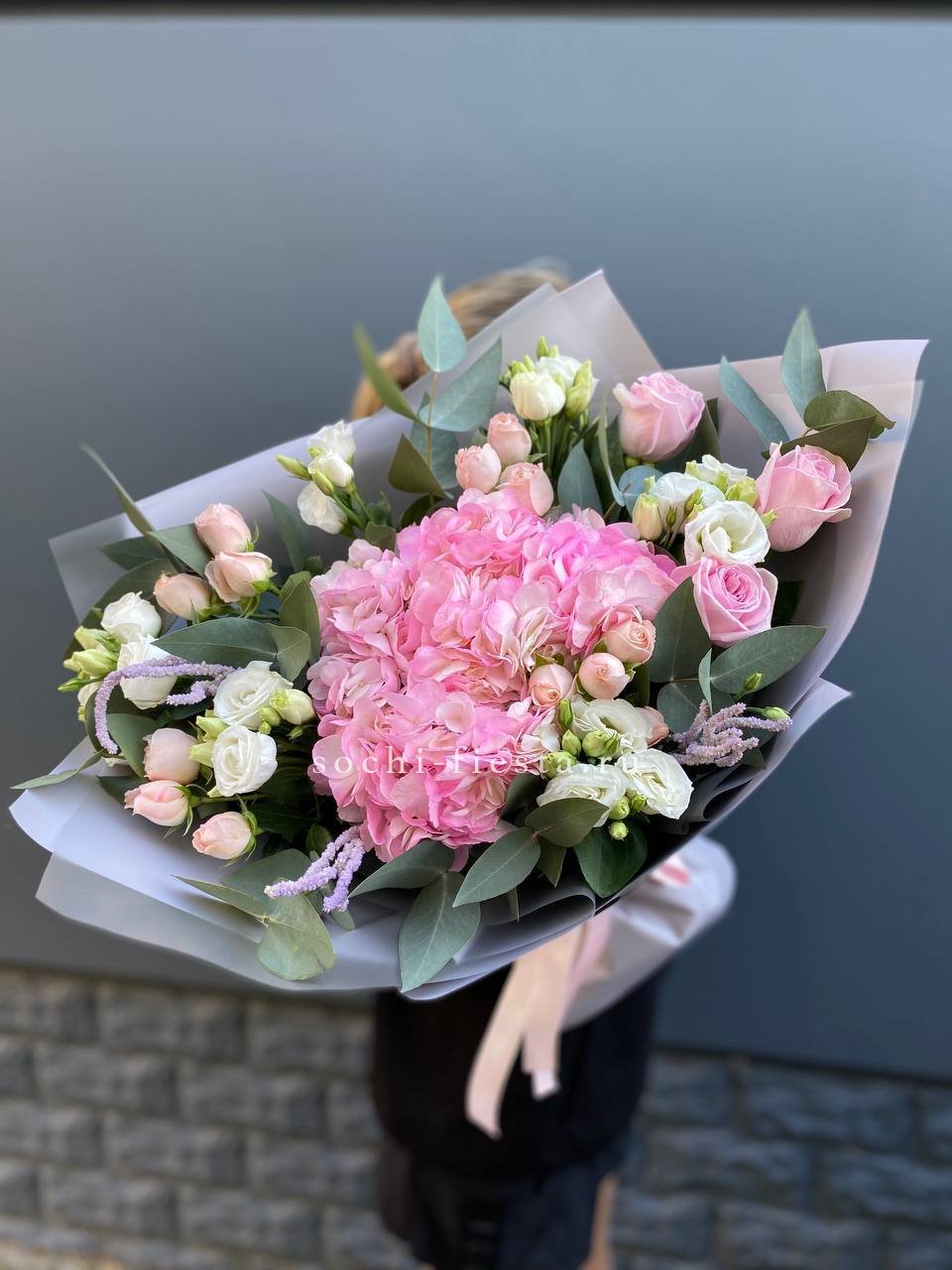гортензия, эустома, кустовая роза, маттиола (или львиный зев), роза одноголовая, каллы (или аналог), эвкалипт, лента, упаковкаСостав букета в несозон может нести незначительные изменения.