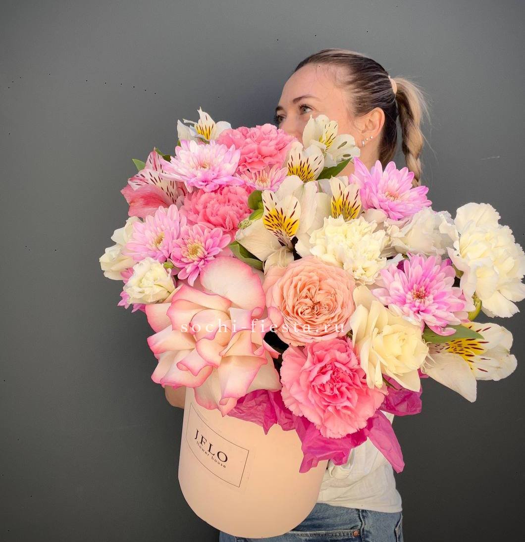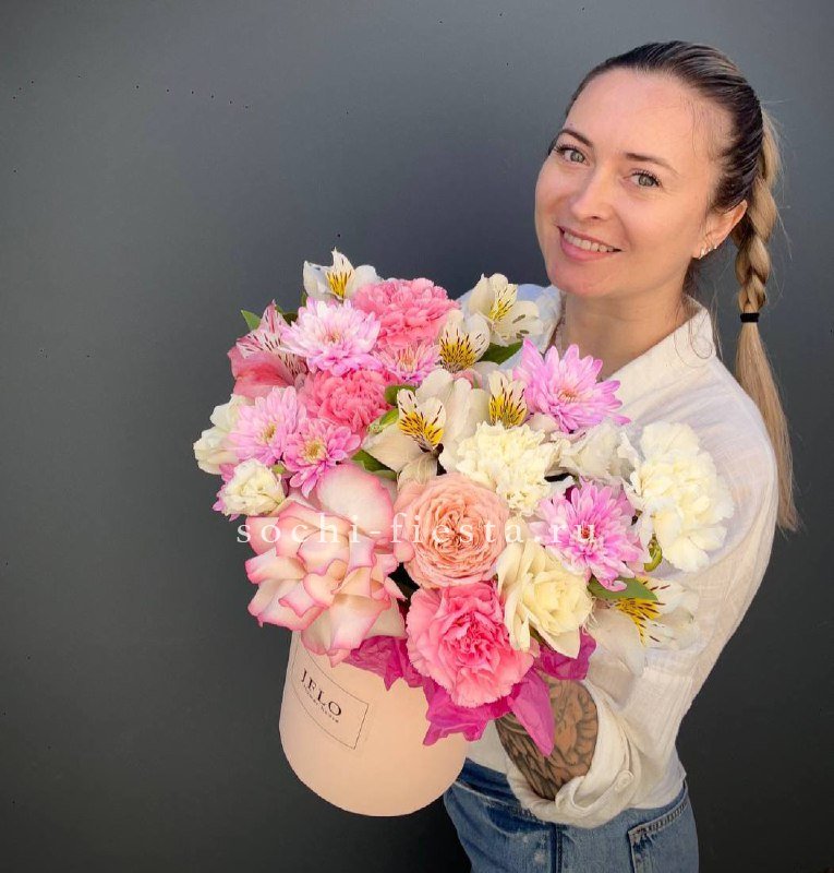Сочетание вывернутых роз с гортензией, диантусами, розами, бомбастиками создает воздушных элегантный образ идеального цветочного подарка
