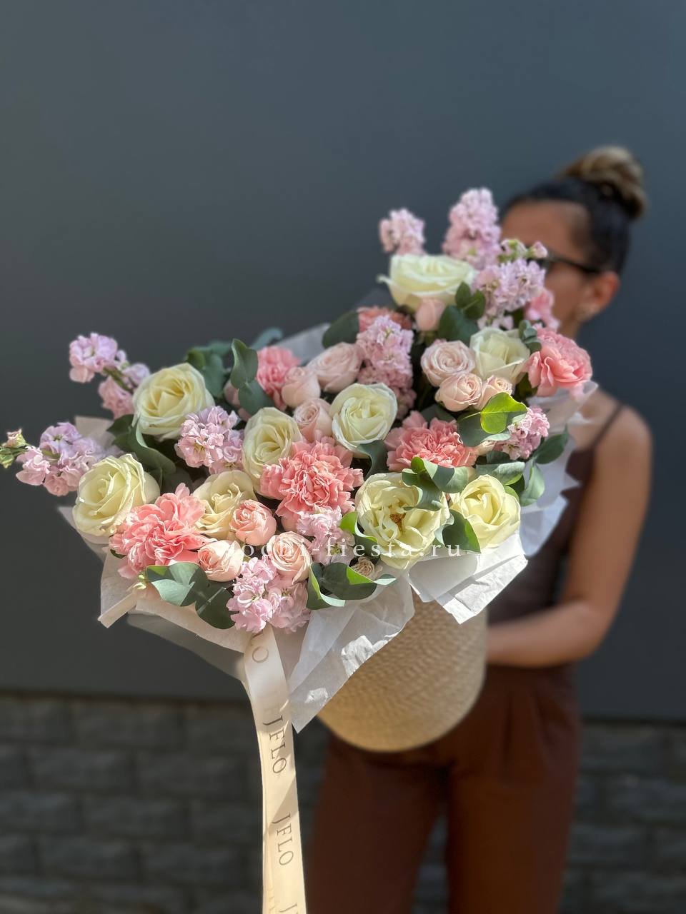 Белоснежные розы переплетаются с лиловыми нотами маттиолы и диантусов. Кустовые соцветия и эвкалипт создают воздушную текстуру в компактном джутовом обрамлении.