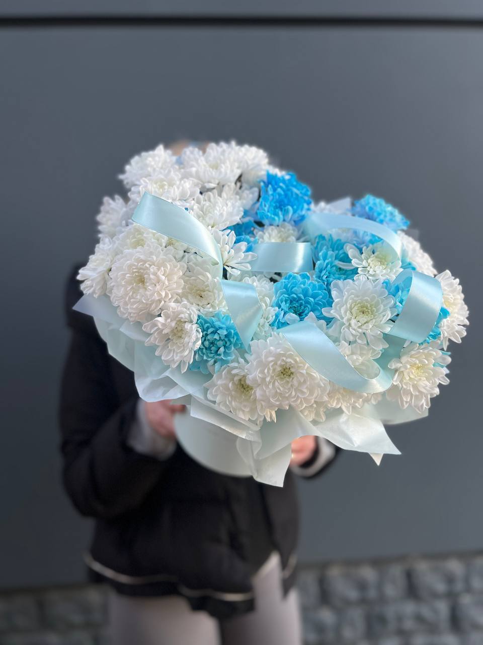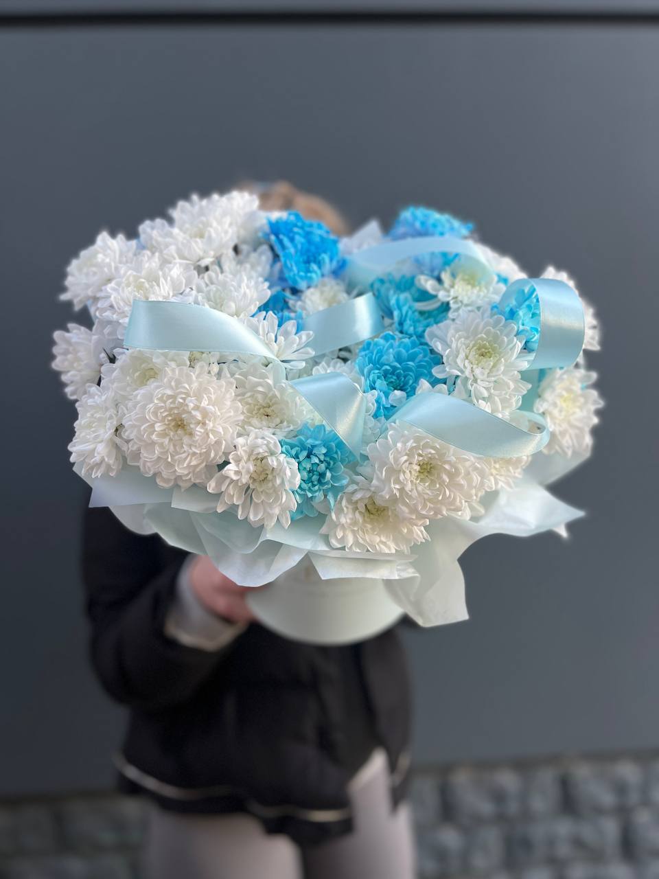 Яркие шапки хризантем собраны в компактной коробке с атласными лентами. Цветы держат форму и радуют свежестью несколько дней подряд. Удобный формат для размещения на столе или комоде.