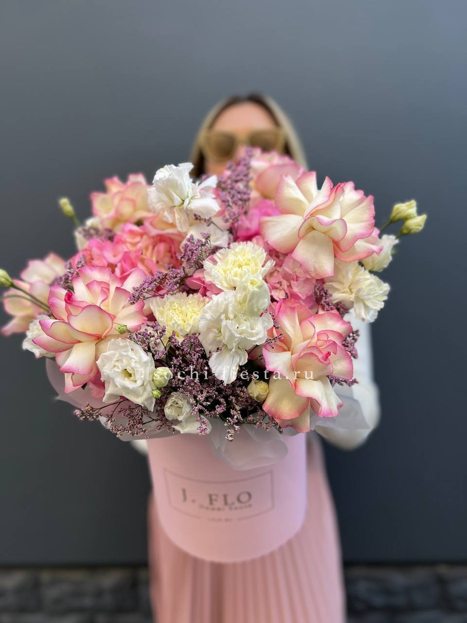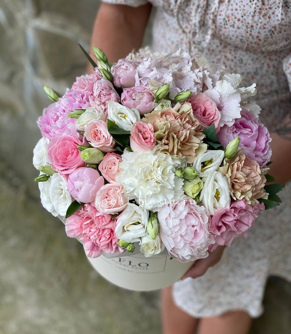 Эустомы и пионовидные розы соседствуют с французскими макарон в коробке в форме сердца. Диантусы и эвкалипт создают объём, а сладкий акцент делает композицию завершённой.