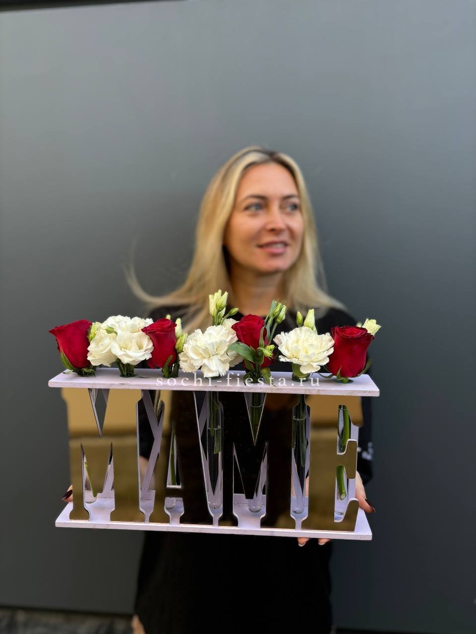 розы, диантусы, эустома, деревянный ящик с колбами.
