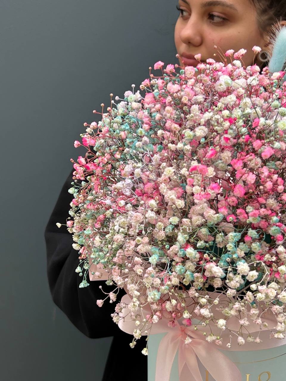 Воздушные ветки гипсофилы окрашены в радужные оттенки и дополнены пушистым лагурусом. Композиция собрана в компактный цилиндр и создаёт яркое цветовое пятно в любом интерьере.