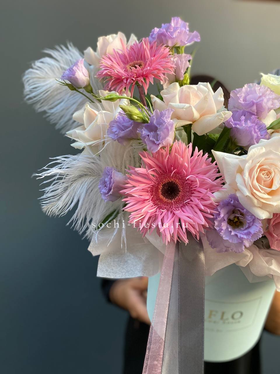 французские розы, эустома, герберы, цилиндр D20,  бумага тишью.