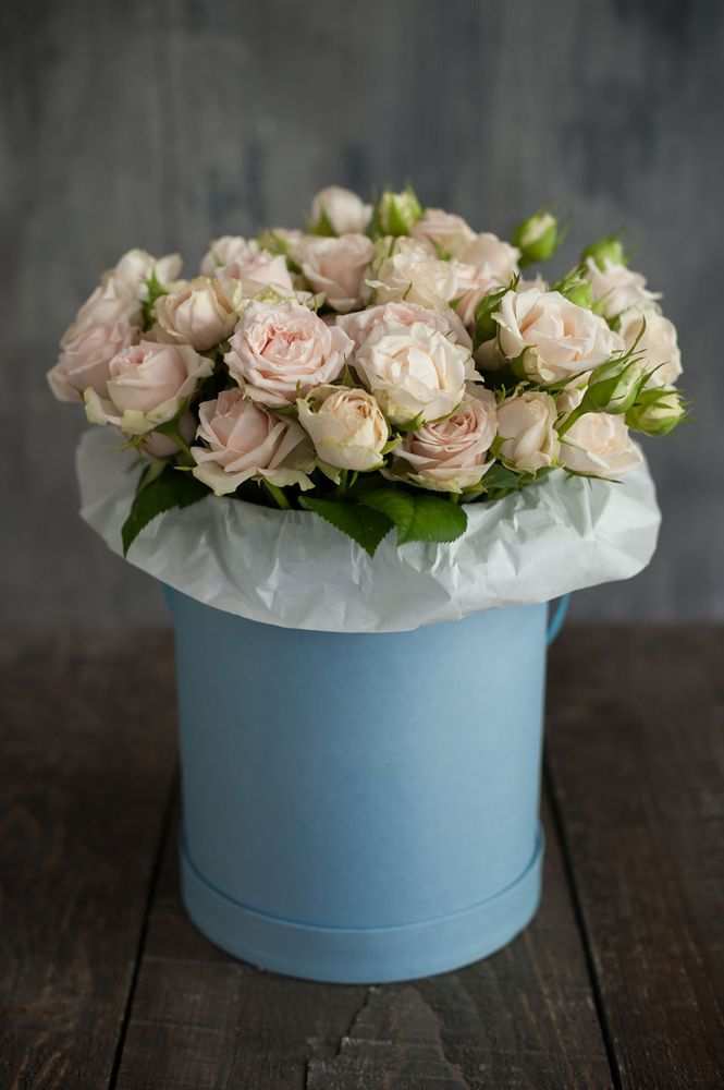 Пионовидные кустовые розы формируют плотный купол с мягкими переходами оттенков. Каждый бутон раскрывается слоями, создавая объёмную текстуру. Эвкалипт добавляет свежести композиции в цилиндре.