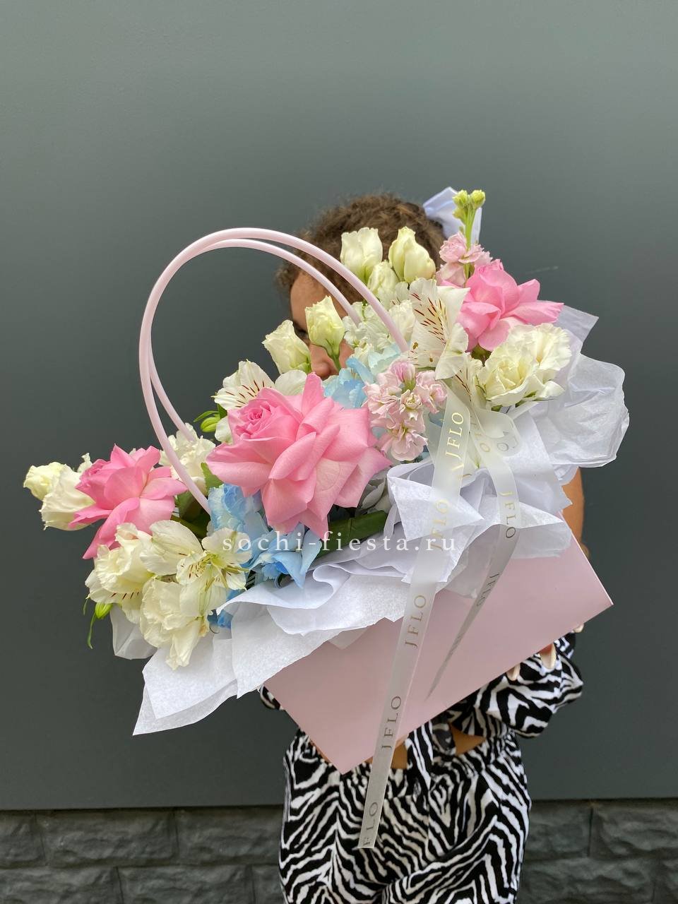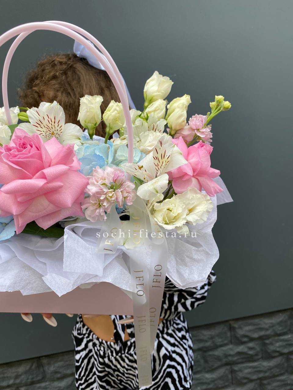 Альстромерии и эустомы создают воздушную текстуру, а розовые розы добавляют композиции яркости. Сумка-кашпо делает презентацию удобной и готовой к вручению без дополнительных хлопот.