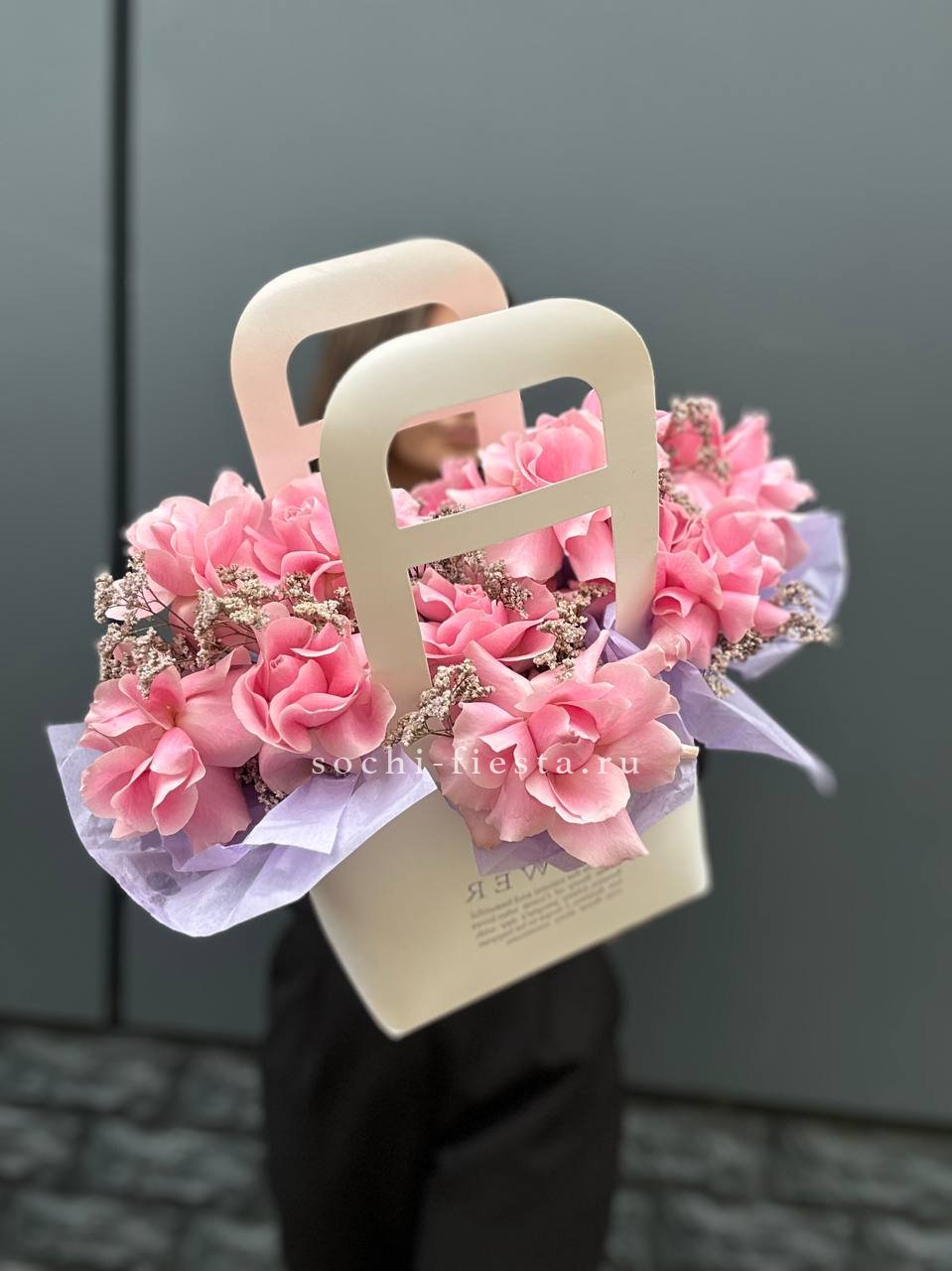 Воздушная композиция из диантусов и альстромерии в удобном формате. Цветы на оазисе держат свежесть долго и не требуют сложного ухода.