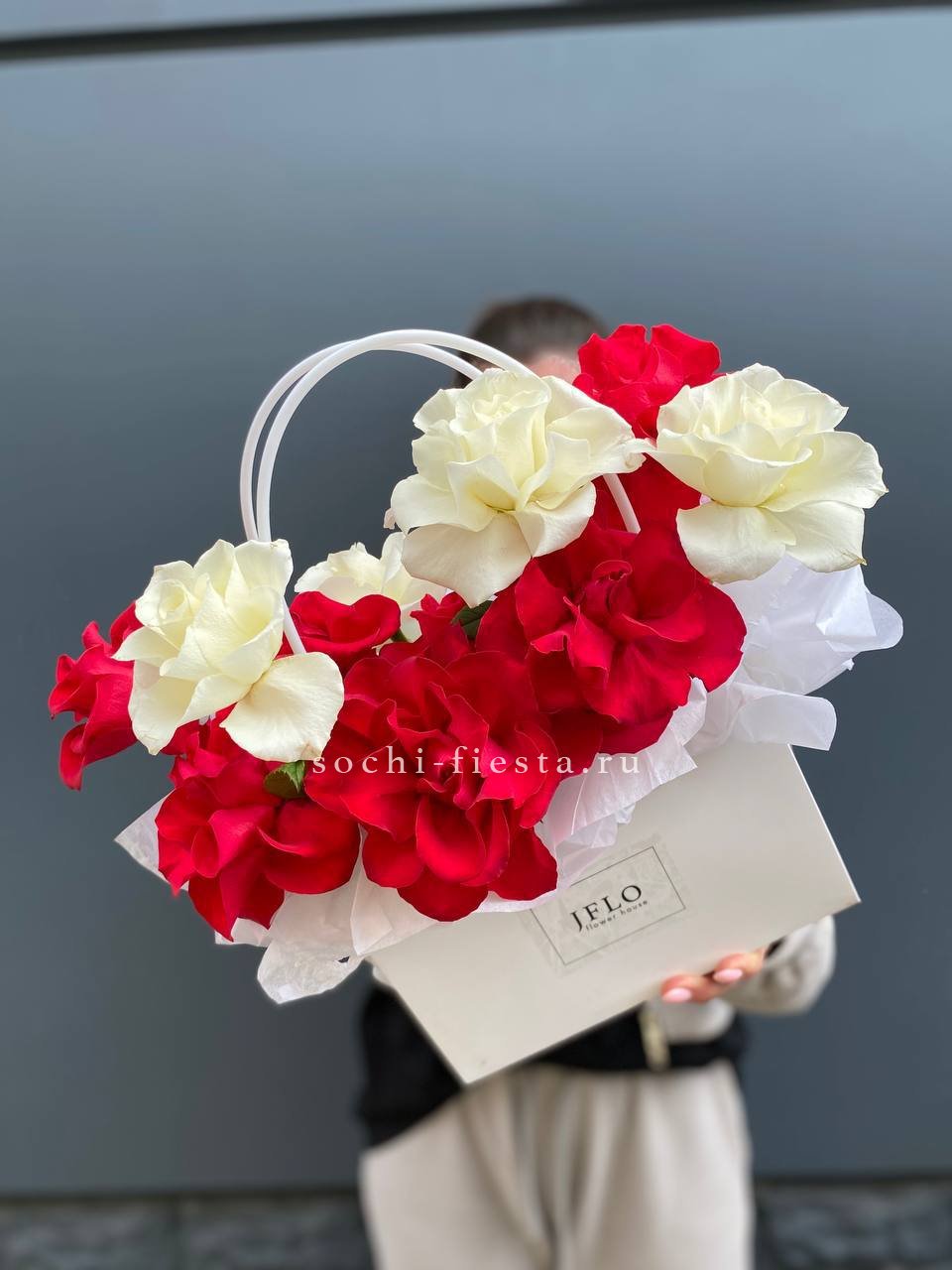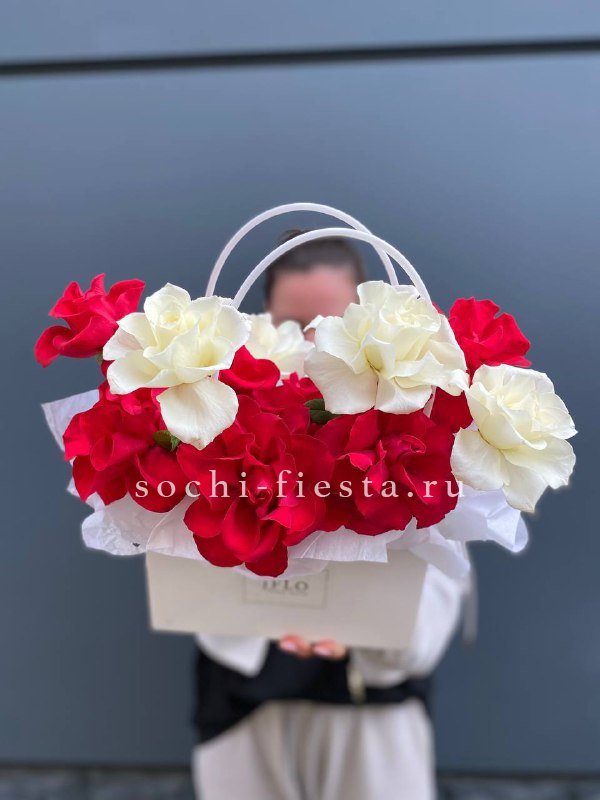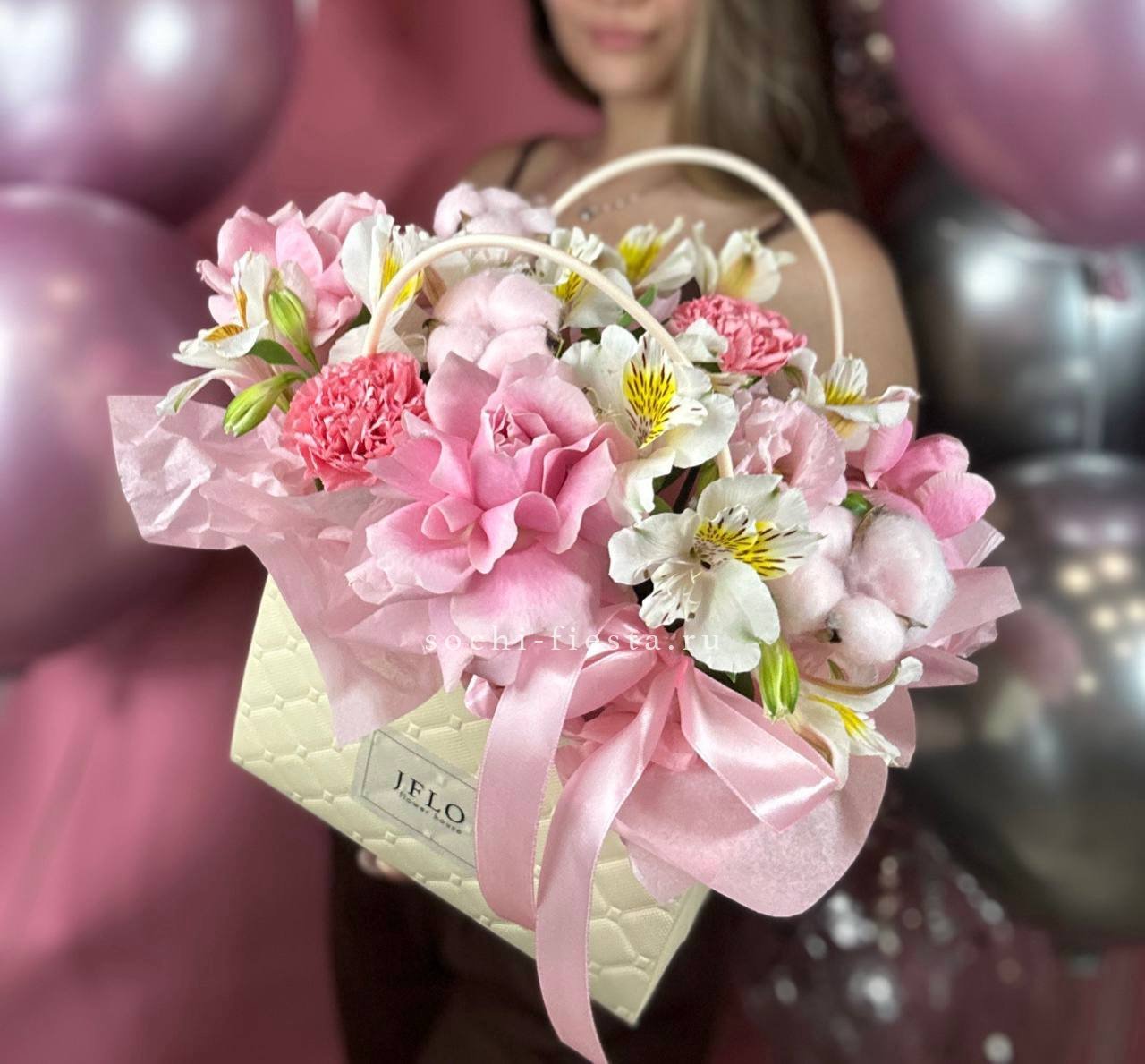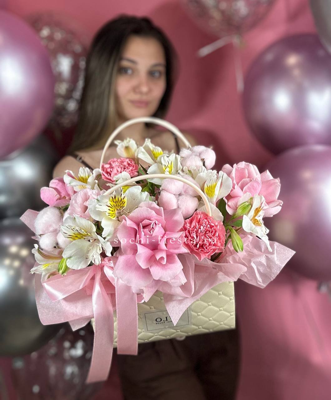 Белые и розовые розы образуют воздушную композицию с мягкими коробочками хлопка и лимониумом. Сумка-кашпо Sofi держит форму и позволяет разместить цветы на столе или полке. Букет выглядит аккуратно и остается свежим долгое время.