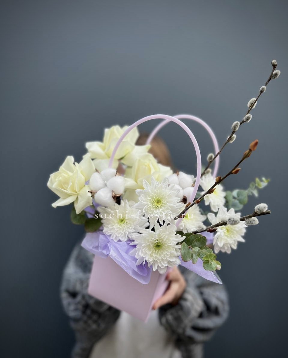 пионовидные кустовые розы, альстромерии, сумочка, лента.
