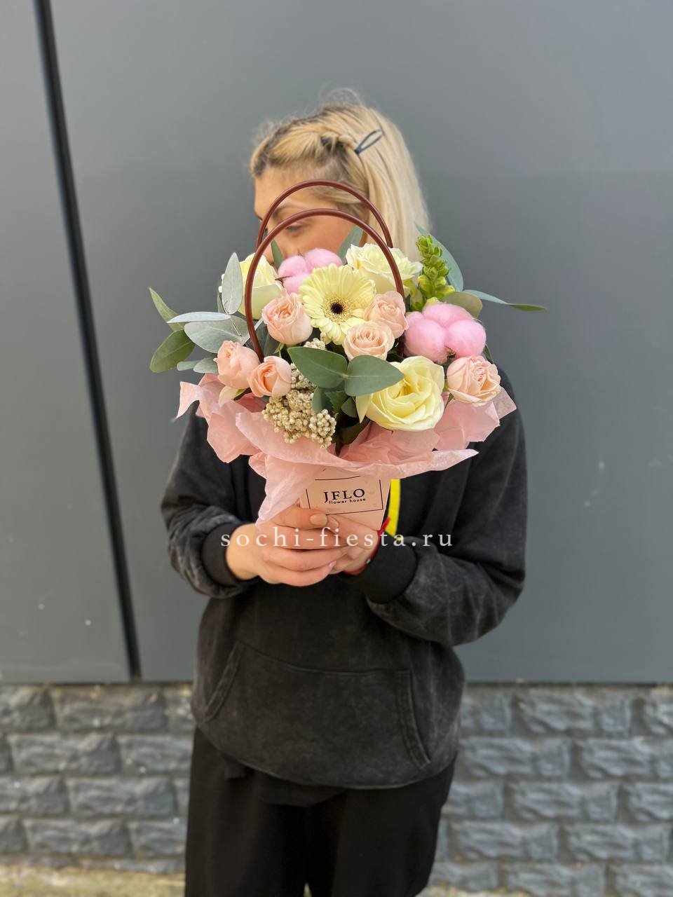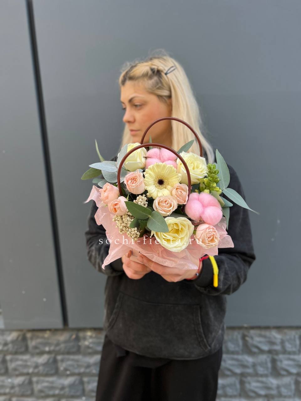 Розовые розы и диантусы переплетаются с кустовыми хризантемами в плотной округлой композиции. Альстромерия добавляет графичные акценты между бутонами. Сумочка собирает все элементы в аккуратную форму с естественным объёмом.
