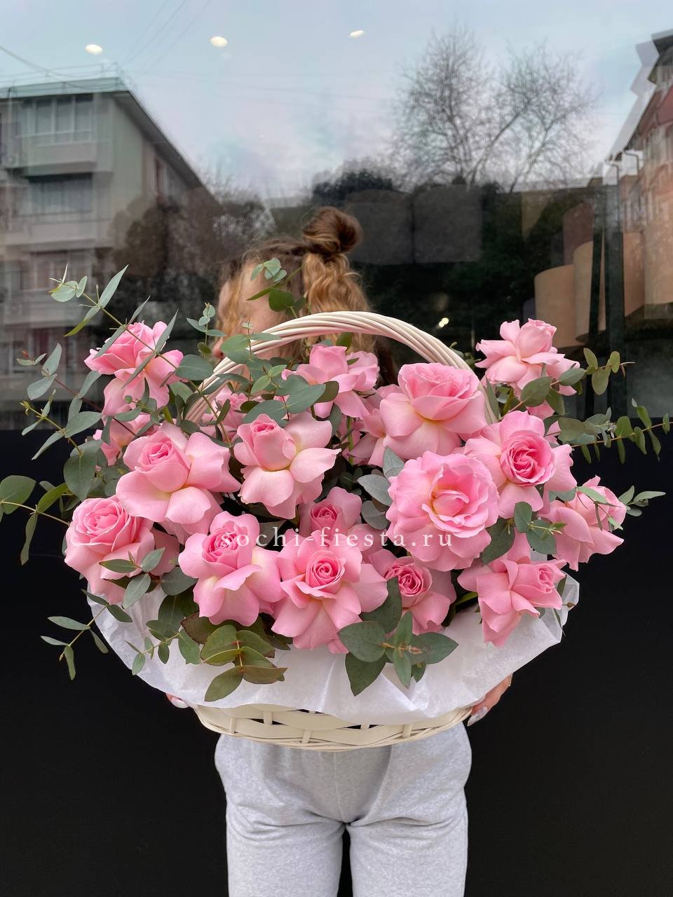 розы, эустома, гортензия, бомбастик, маттиола ( или аналог), эвкалипт, корзина.