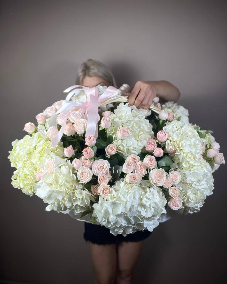 Пышная корзина с розами и гортензиями собрана плотно и объёмно. Маттиола добавляет живую текстуру между крупными соцветиями, а кустовые розы заполняют композицию мягкими переходами. Результат — впечатляющее присутствие, которое меняет восприятие пространства.