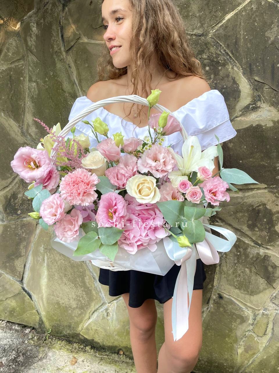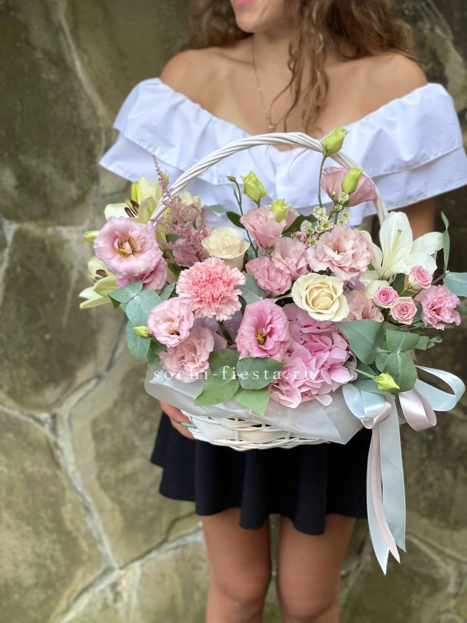 роза одноголовая, эустома, гортензия, мисти баблс, диантус, декоративная зелень, корзина D20. Итоговая корзинка может иметь композиционные отличия в зависимости от сезонности компонентов. При этом внешний вид, объем, цена компонентов, а также цветовая гамма композиции будут соответствовать оригиналу.