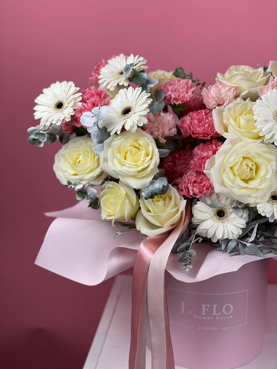 Маттиола и диантусы наполняют корзину летним ароматом. Кустовые розы чередуются с эустомой, создавая мягкий переход оттенков.