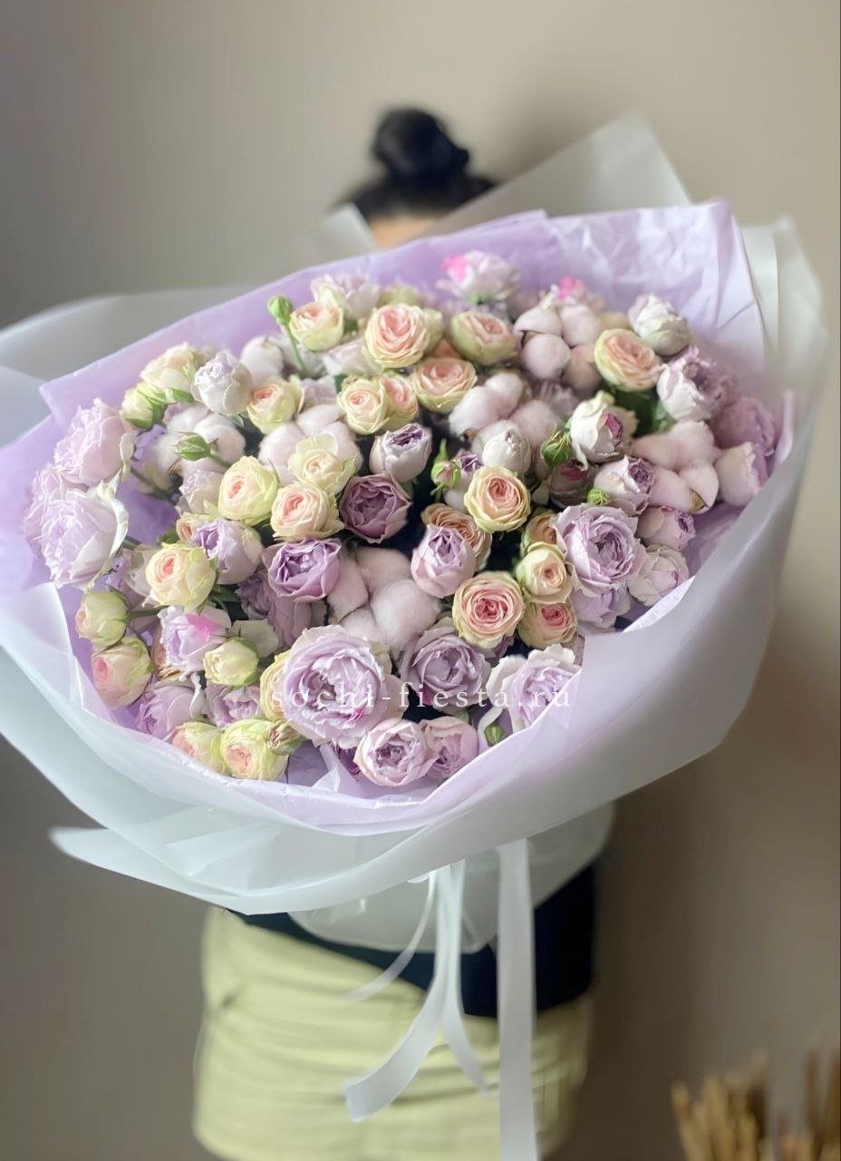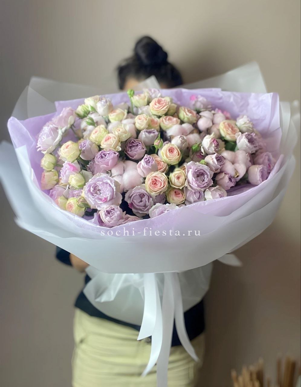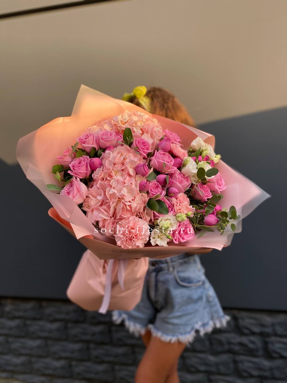 розы, кустовые розы, гортензия, маттиола (или аналог вне сезона), эустома, эвкалипт, лента, дизайнерская упаковка.