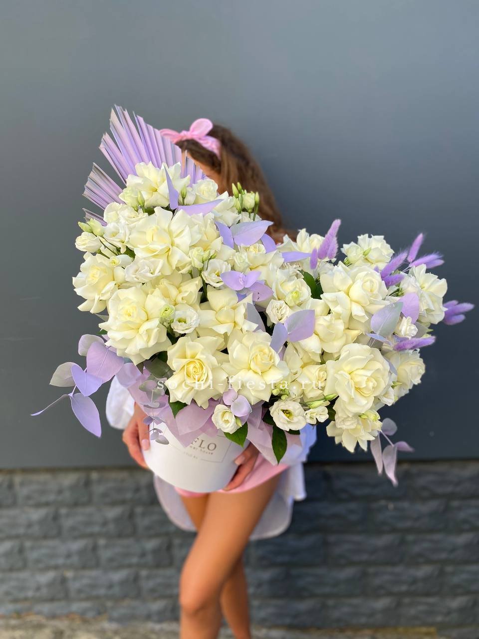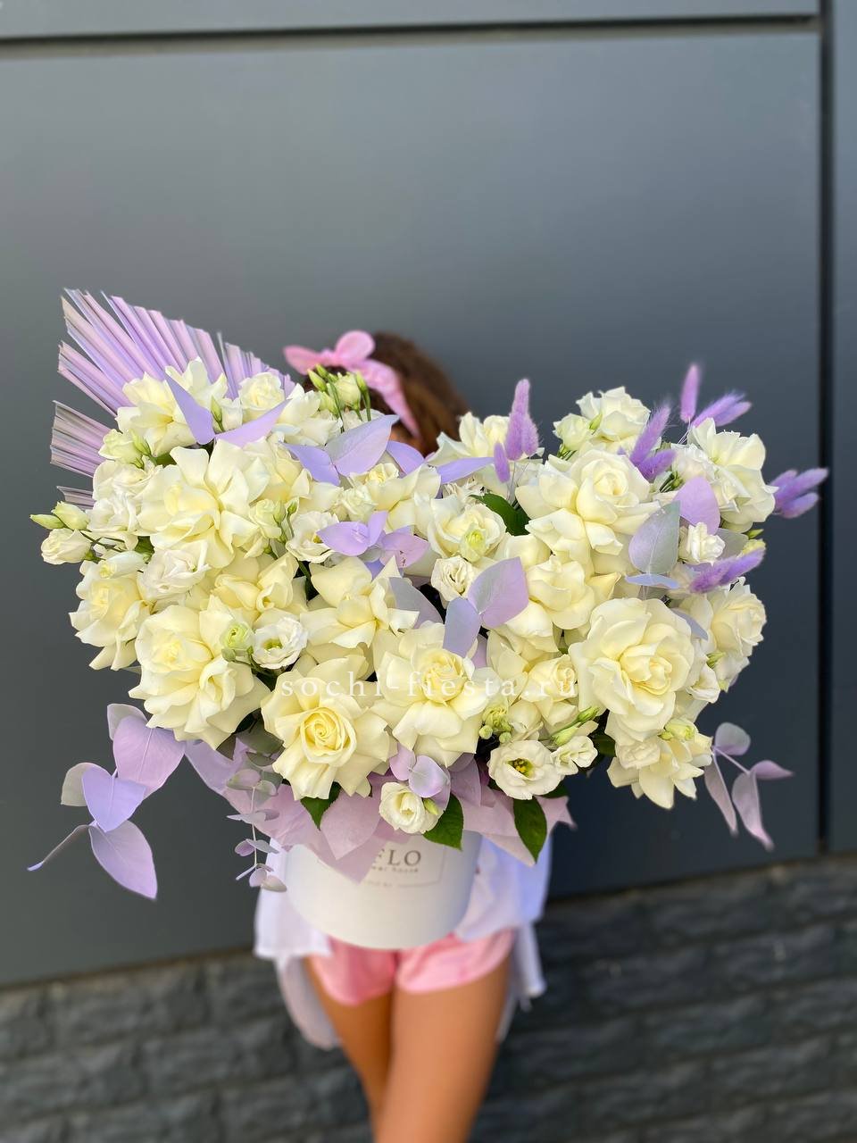 Пятьдесят один бутон Мисти Баблс собраны в плетёную корзину и образуют плотную цветущую полусферу. Лавандовые оттенки раскрываются постепенно и держат форму долго.
