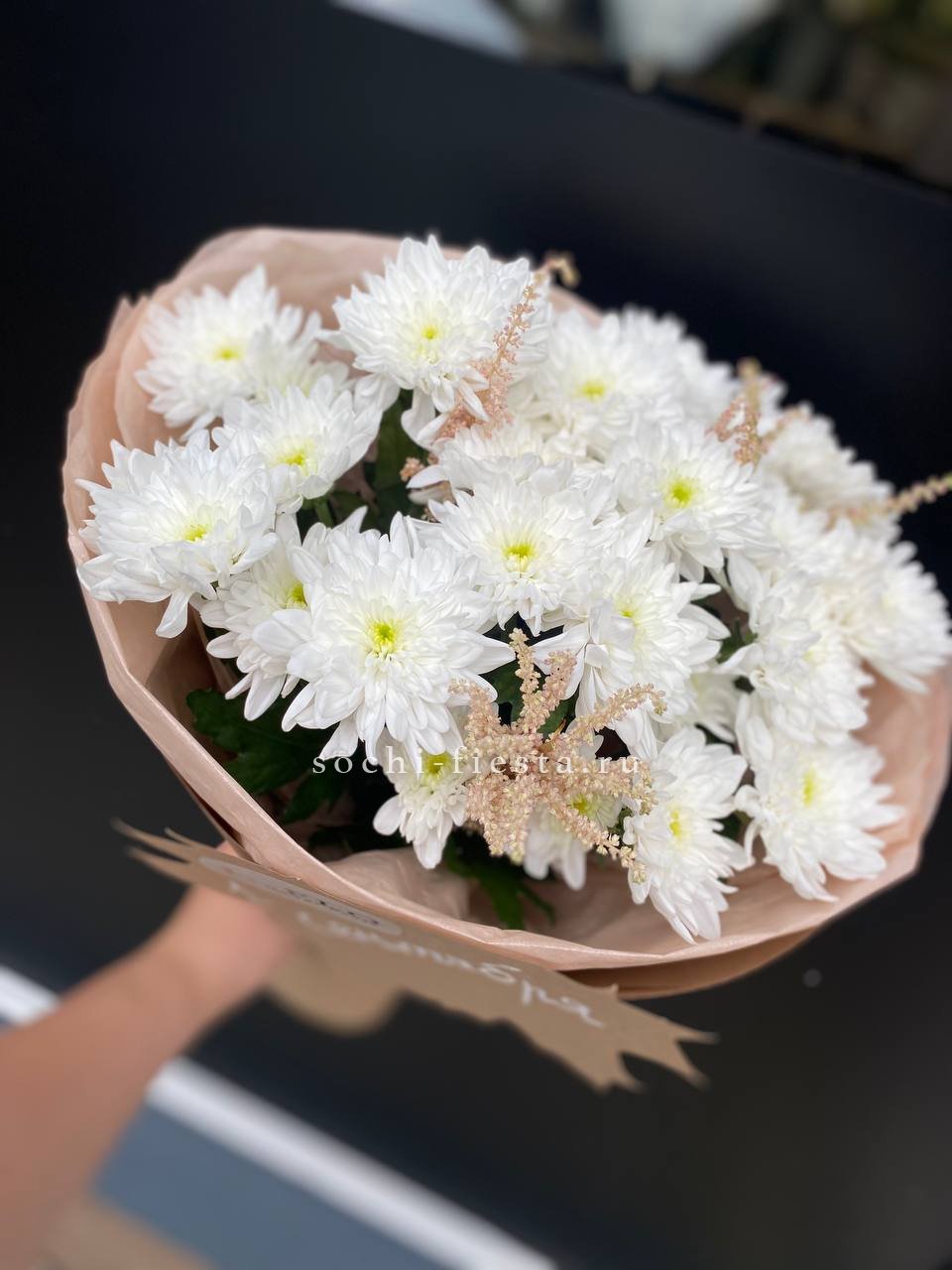хризантемы 5 шт., астильба 2 шт., авторское оформление.